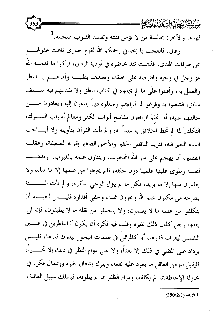 - وقال: فالعجب يا إخواني رحمكم الله لقوم حيارى تاهت عقولهم عن طرقات الهدى، فذهبت تند محاضره في أودية الردى، تركوا ما قدمه الله عز وجل في وحيه وافترضه على خلقه، وتعبدهم بطلبه وأمرهم بالنظر والعمل به، وأقبلوا على ما لم يجدوه في كتاب ناطق ولا تقدمهم فيه سلف سابق، فشغلوا به وفرغوا له آراءهم وجعلوه ديناً يدعون إليه ويعادون من خالفهم عليه، أما عَلِمَ الزائغون مفاتيح أبواب الكفر ومعالم أسباب الشرك، التكلف لما لم تحط الخلائق به علماً به، ولم يأت القرآن بتأويله ولا أباحت السنة النظر فيه، فتزيد الناقص الحقير والأحمق الصغير بقوته الضعيفة، وعقله القصير، أن يهجم على سر الله المحجوب، ويتناول علمه بالغيوب، يريدها لنفسه وطوى عليها علمها دون خلقه، فلم يحيطوا من علمها إلا بما شاء، ولا يعلمون منها إلا ما يريد، فكل ما لم ينزل الوحي بذكره، ولم تأت السنة بشرحه من مكنون علم الله ومخزون غيبه، وخفي أقداره فليس للعباد أن يتكلفوا من علمه ما لا يعلمون، ولا يتحملوا من نقله ما لا يطيقون، فإنه لن يعدوا رجل كلف ذلك نظره وقلب فيه فكره أن يكون كالناظرين في عين الشمس ليعرف قدرها، أو كالمرتمي في ظلمات البحور ليدرك قعرها، فليس يزداد على المضي في ذلك إلا بعداً، ولا على دوام النظر في ذلك إلا تحيراً، فليقبل المؤمن العاقل ما يعود عليه نفعه، ويترك إشغال نظره وإعمال فكره في محاولة الإحاطة بما لم يكلفه، ومرام الظفر بما لم يطوقه، فيسلك سبيل العافية،