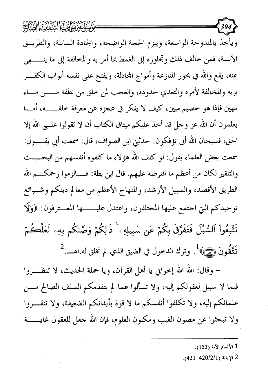 أخذ عليكم ميثاق الكتاب أن لا تقولوا على الله إلا الحق، فسبحان الله أنى تؤفكون. حدثني ابن الصواف، قال: سمعت أبي يقول: سمعت بعض العلماء يقول: لو كلف الله هؤلاء ما كلفوه أنفسهم من البحث والتنقير لكان من أعظم ما افترضه عليهم. قال ابن بطة: فالزموا رحمكم الله الطريق الأقصد، والسبيل الأرشد، والمنهاج الأعظم من معالم دينكم وشرائع توحيدكم التي اجتمع عليها المختلفون، واعتدل عليها المعترفون: {وَلَا تَتَّبِعُوا السُّبُلَ فَتَفَرَّقَ بِكُمْ عَنْ سَبِيلِهِ ذَلِكُمْ وَصَّاكُمْ بِهِ لَعَلَّكُمْ تَتَّقُونَ (153)} (¬1). وترك الدخول في الضيق الذي لم نخلق له. اهـ. (¬2)