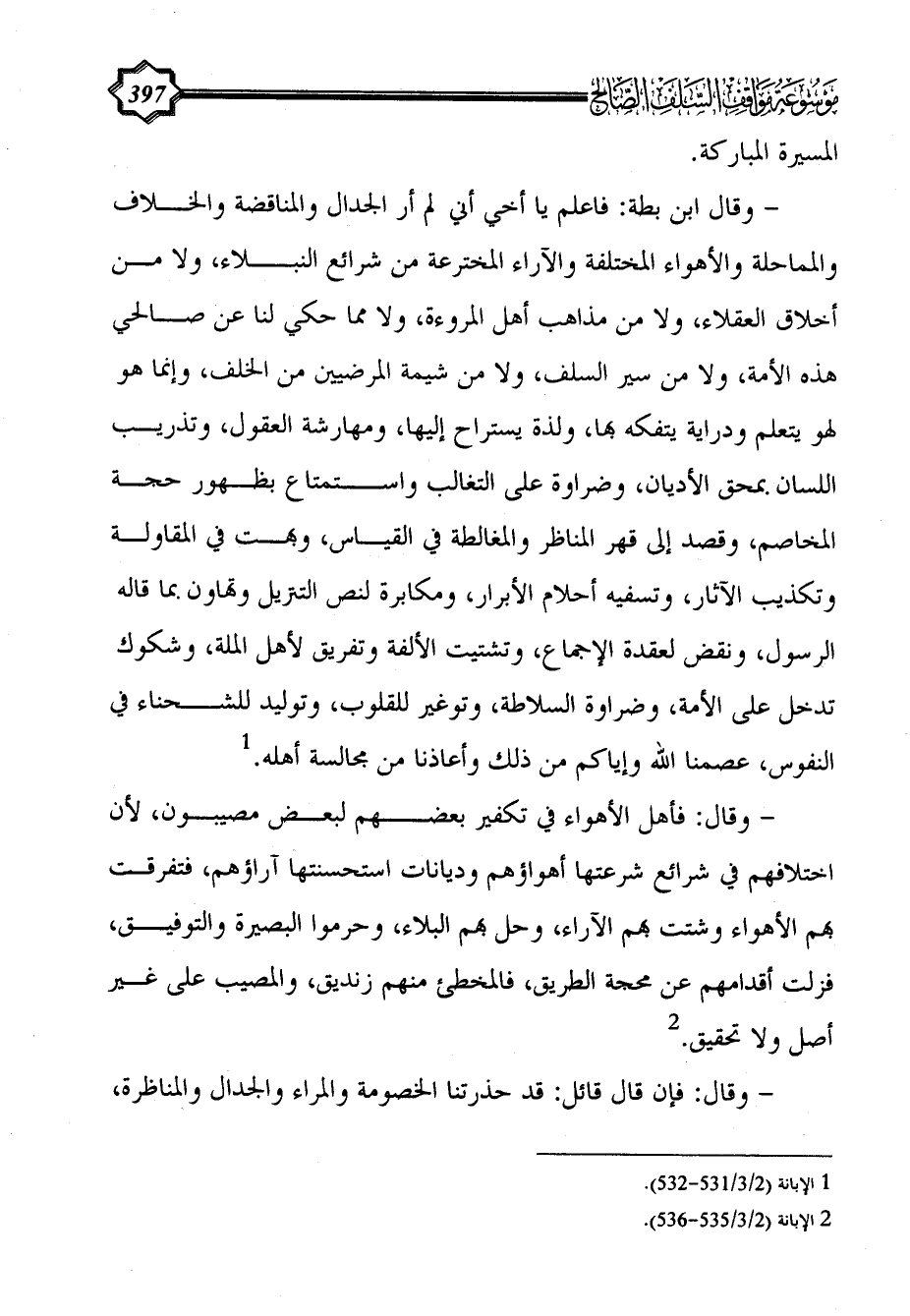 - وقال ابن بطة: فاعلم يا أخي أني لم أر الجدال والمناقضة والخلاف والمماحلة والأهواء المختلفة والآراء المخترعة من شرائع النبلاء، ولا من أخلاق العقلاء، ولا من مذاهب أهل المروءة، ولا مما حكي لنا عن صالحي هذه الأمة، ولا من سير السلف، ولا من شيمة المرضيين من الخلف، وإنما هو لهو يتعلم ودراية يتفكه بها، ولذة يستراح إليها، ومهارشة العقول، وتذريب اللسان بمحق الأديان، وضراوة على التغالب واستمتاع بظهور حجة المخاصم، وقصد إلى قهر المناظر والمغالطة في القياس، وبهت في المقاولة وتكذيب الآثار، وتسفيه أحلام الأبرار، ومكابرة لنص التنزيل وتهاون بما قاله الرسول، ونقض لعقدة الإجماع، وتشتيت الألفة وتفريق لأهل الملة، وشكوك تدخل على الأمة، وضراوة السلاطة، وتوغير للقلوب، وتوليد للشحناء في النفوس، عصمنا الله وإياكم من ذلك وأعاذنا من مجالسة أهله. (¬1)