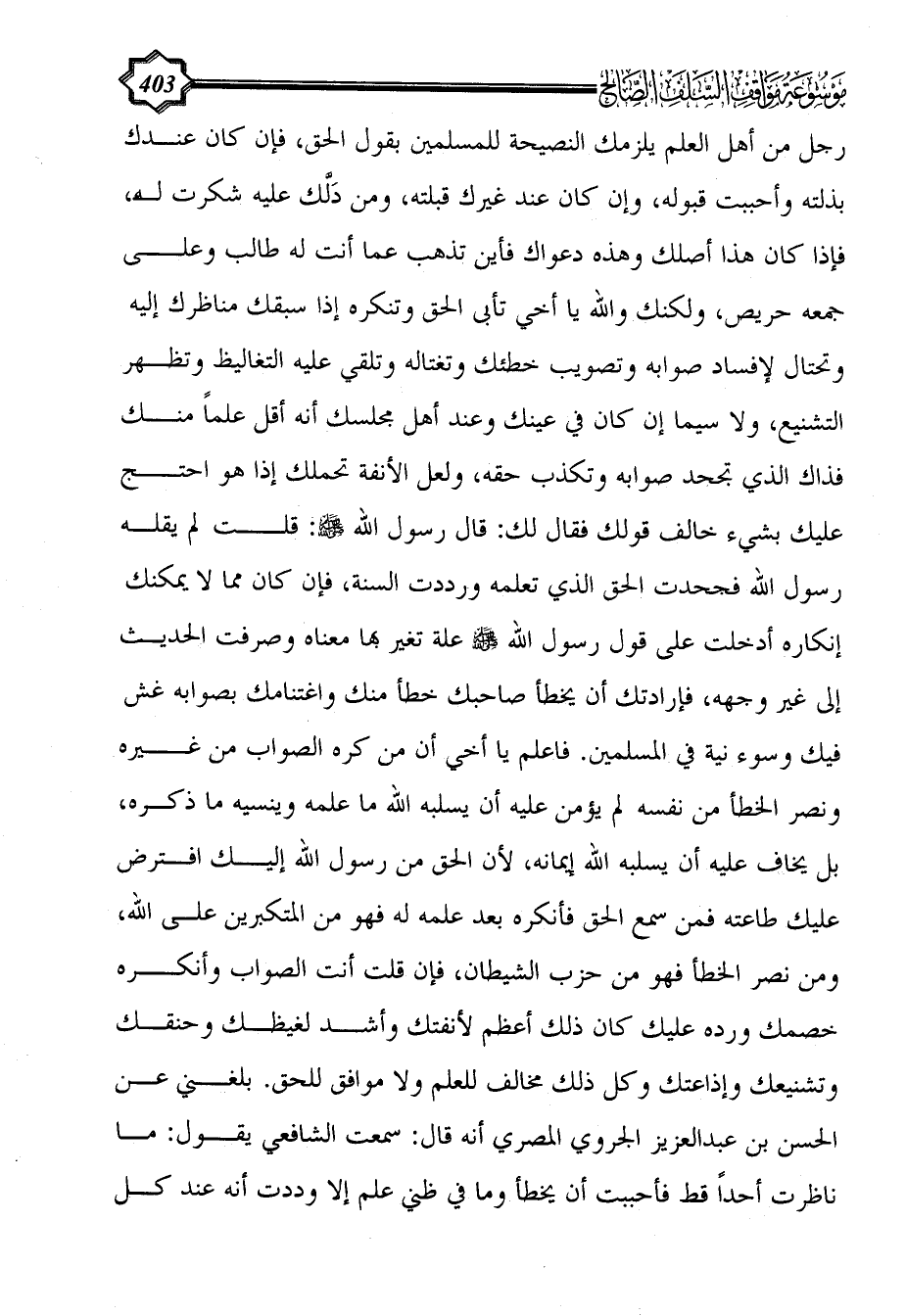 فاعلم يا أخي أن من كره الصواب من غيره ونصر الخطأ من نفسه لم يؤمن عليه أن يسلبه الله ما علمه وينسيه ما ذكره، بل يخاف عليه أن يسلبه الله إيمانه، لأن الحق من رسول الله إليك افترض عليك طاعته فمن سمع الحق فأنكره بعد علمه له فهو من المتكبرين على الله، ومن نصر الخطأ فهو من حزب الشيطان، فإن قلت أنت الصواب وأنكره خصمك ورده عليك كان ذلك أعظم لأنفتك وأشد لغيظك وحنقك وتشنيعك وإذاعتك وكل ذلك مخالف للعلم ولا موافق للحق. بلغني عن الحسن بن عبد العزيز الجروي المصري أنه قال: سمعت الشافعي يقول: ما ناظرت أحداً قط فأحببت أن يخطأ وما في ظني علم إلا وددت أنه عند كل
