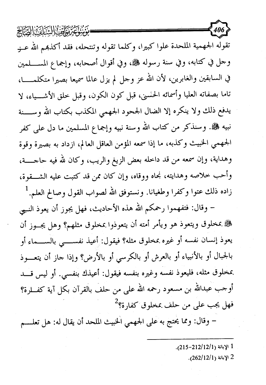 - وقال: فتفهموا رحمكم الله هذه الأحاديث، فهل يجوز أن يعوذ النبي - صلى الله عليه وسلم - بمخلوق ويتعوذ هو ويأمر أمته أن يتعوذوا بمخلوق مثلهم؟ وهل يجوز أن يعوذ إنسان نفسه أو غيره بمخلوق مثله؟ فيقول: أعيذ نفسي بالسماء أو بالجبال أو بالأنبياء أو بالعرش أو بالكرسي أو بالأرض؟ وإذا جاز أن يتعوذ بمخلوق مثله، فليعوذ نفسه وغيره بنفسه فيقول: أعيذك بنفسي. أو ليس قد أوجب عبد الله بن مسعود رحمه الله على من حلف بالقرآن بكل آية كفارة؟ فهل يجب على من حلف بمخلوق كفارة؟ (¬2)