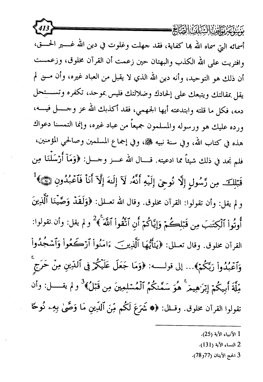 إلى قوله: {وَمَا جَعَلَ عَلَيْكُمْ فِي الدِّينِ مِنْ حَرَجٍ مِلَّةَ أَبِيكُمْ إِبْرَاهِيمَ هُوَ سَمَّاكُمُ الْمُسْلِمِينَ مِنْ قَبْلُ} (¬3) ولم يقل: وأن تقولوا القرآن مخلوق. وقال: {* شَرَعَ لَكُمْ مِنَ الدِّينِ مَا وَصَّى بِهِ نُوحًا