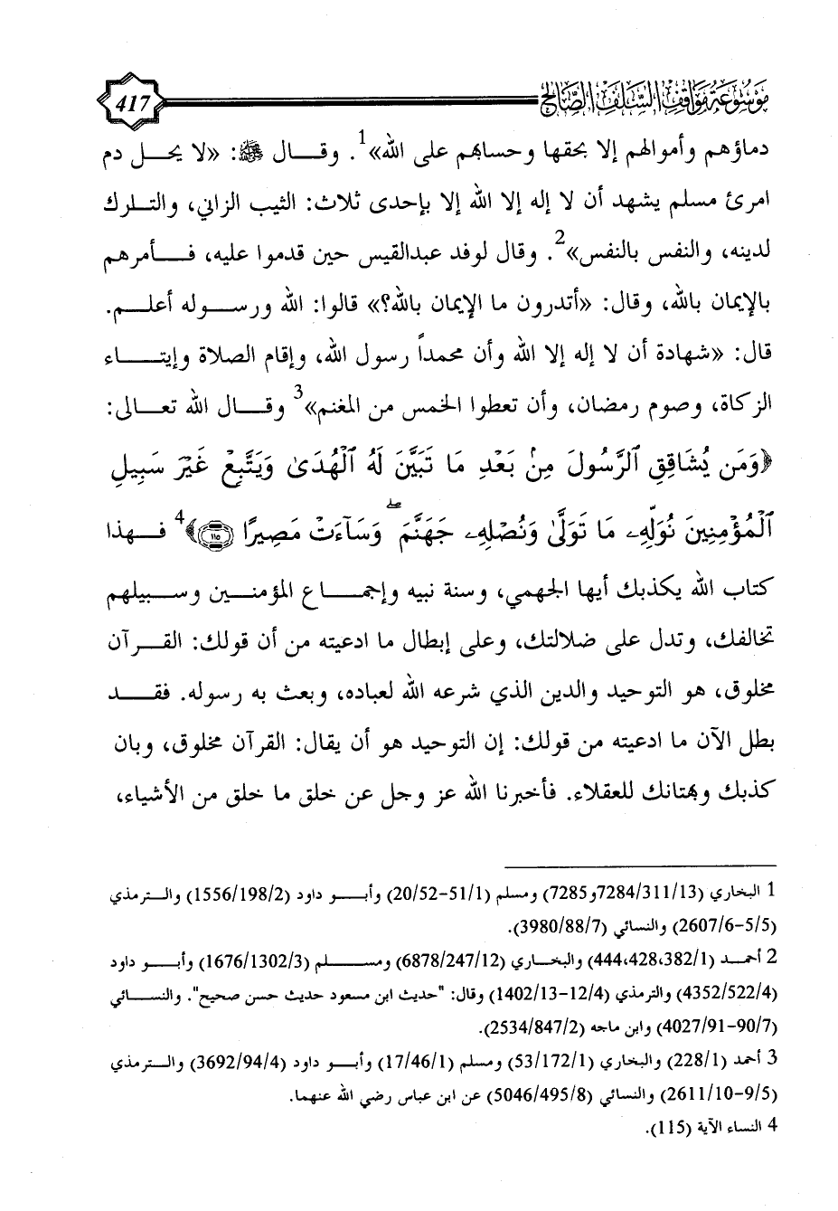 (¬1) البخاري (13/ 311/7284و7285) ومسلم (1/ 51 - 52/ 20) وأبو داود (2/ 198/1556) والترمذي (5/ 5 - 6/ 2607) والنسائي (7/ 88/3980).