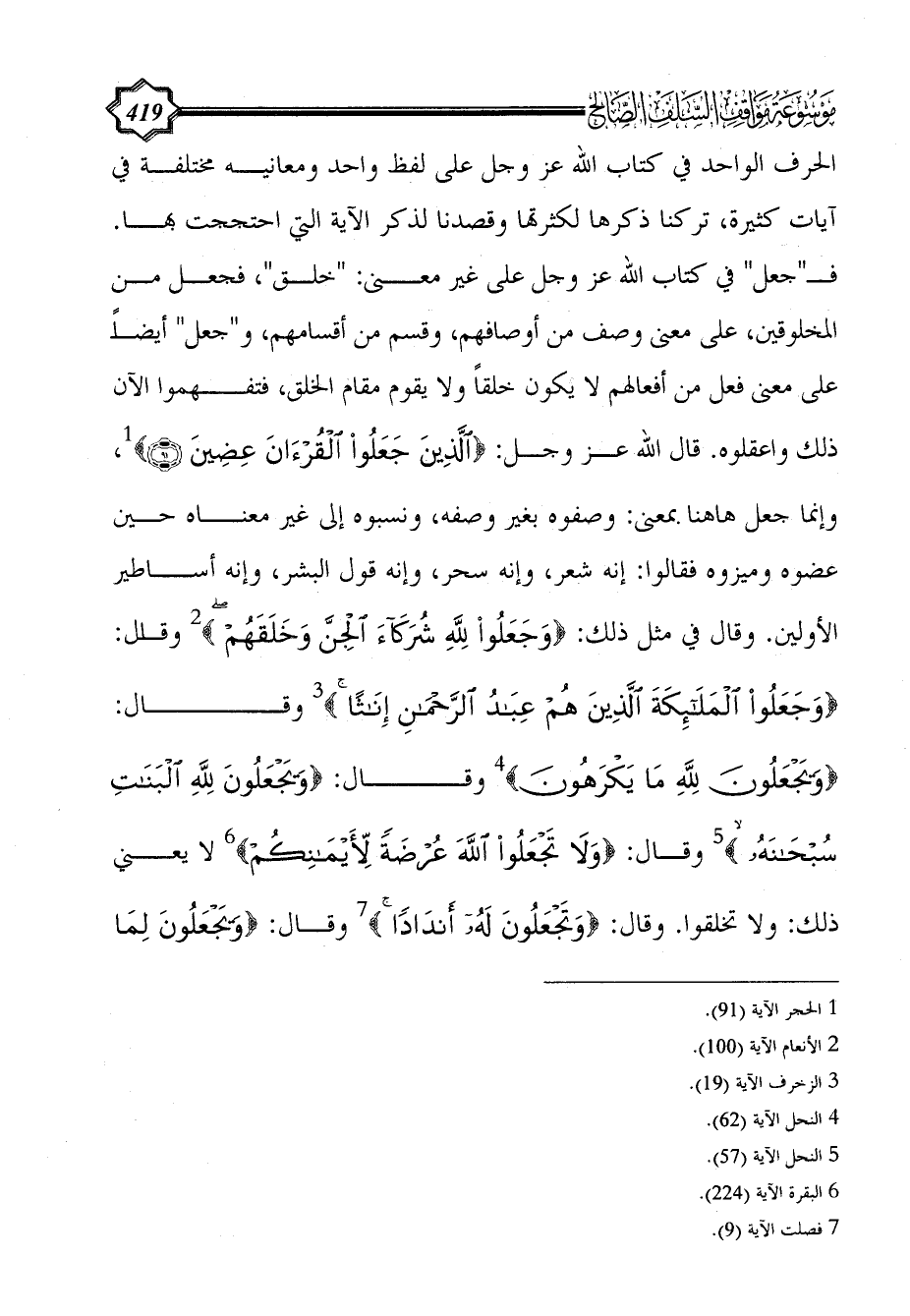 الحرف الواحد في كتاب الله عز وجل على لفظ واحد ومعانيه مختلفة في آيات كثيرة، تركنا ذكرها لكثرتها وقصدنا لذكر الآية التي احتججت بها. فـ"جعل" في كتاب الله عز وجل على غير معنى: "خلق"، فجعل من المخلوقين، على معنى وصف من أوصافهم، وقسم من أقسامهم، و"جعل" أيضاً على معنى فعل من أفعالهم لا يكون خلقاً ولا يقوم مقام الخلق، فتفهموا الآن ذلك واعقلوه. قال الله عز وجل: {الَّذِينَ جَعَلُوا الْقُرْآَنَ عِضِينَ (91)} (¬1)، وإنما جعل هاهنا بمعنى: وصفوه بغير وصفه، ونسبوه إلى غير معناه حين عضوه وميزوه فقالوا: إنه شعر، وإنه سحر، وإنه قول البشر، وإنه أساطير الأولين. وقال في مثل ذلك: {وَجَعَلُوا لِلَّهِ شُرَكَاءَ الْجِنَّ وَخَلَقَهُمْ} (¬2) وقال: {وَجَعَلُوا الْمَلَائِكَةَ الَّذِينَ هُمْ عِبَادُ الرَّحْمَنِ إِنَاثًا} (¬3) وقال: {وَيَجْعَلُونَ لِلَّهِ مَا يَكْرَهُونَ} (¬4) وقال: {وَيَجْعَلُونَ لِلَّهِ الْبَنَاتِ سُبْحَانَهُ} (¬5)