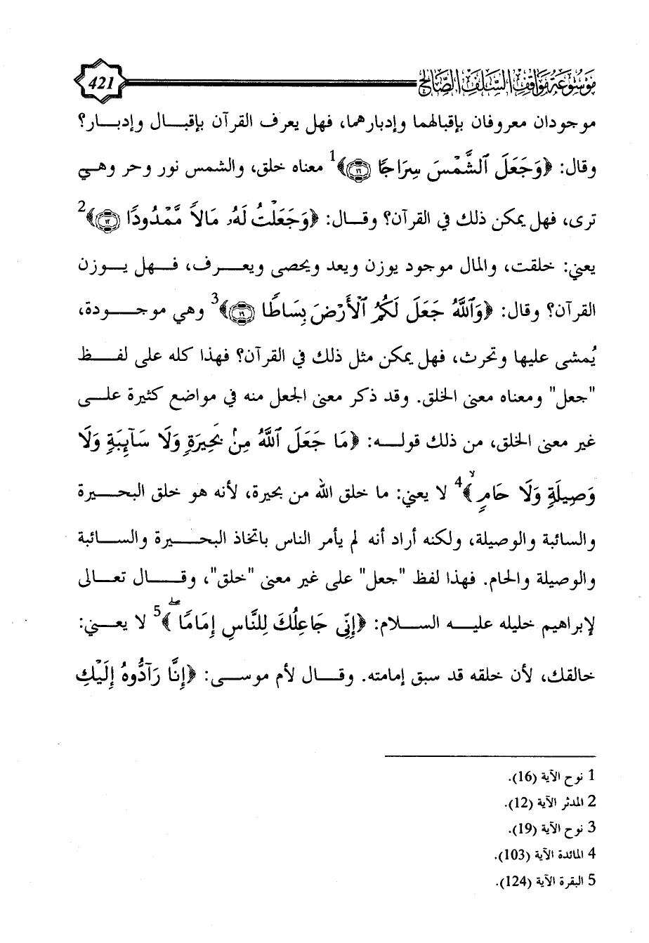يعني: خلقت، والمال موجود يوزن ويعد ويحصى ويعرف، فهل يوزن القرآن؟ وقال: {وَاللَّهُ جَعَلَ لَكُمُ الْأَرْضَ بِسَاطًا (19)} (¬3) وهي موجودة، يُمشى عليها وتحرث، فهل يمكن مثل ذلك في القرآن؟ فهذا كله على لفظ "جعل" ومعناه معنى الخلق. وقد ذكر معنى الجعل منه في مواضع كثيرة على غير معنى الخلق، من ذلك قوله: {مَا جَعَلَ اللَّهُ مِنْ بَحِيرَةٍ وَلَا سائبة وَلَا وَصِيلَةٍ وَلَا حَامٍ} (¬4) لا يعني: ما خلق الله من بحيرة، لأنه هو خلق البحيرة والسائبة والوصيلة، ولكنه أراد أنه لم يأمر الناس باتخاذ البحيرة والسائبة والوصيلة والحام. فهذا لفظ "جعل" على غير معنى "خلق"، وقال تعالى لإبراهيم خليله عليه السلام: {إِنِّي جَاعِلُكَ لِلنَّاسِ إِمَامًا} (¬5) لا يعني: خالقك، لأن خلقه قد سبق إمامته. وقال لأم موسى: {إِنَّا رَادُّوهُ إِلَيْكِ