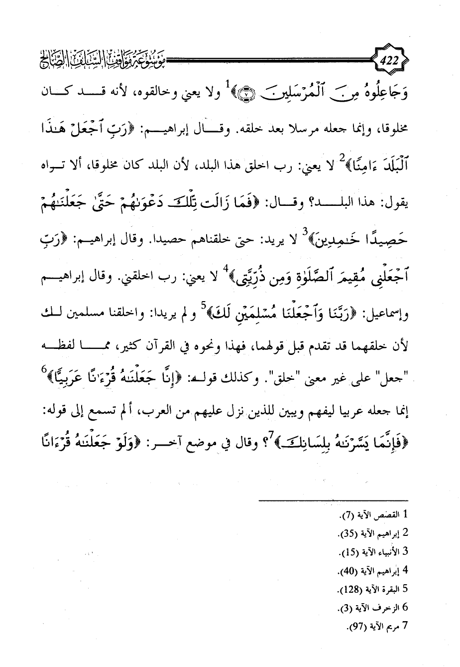وَجَاعِلُوهُ مِنَ الْمُرْسَلِينَ (7)} (¬1) ولا يعني وخالقوه، لأنه قد كان مخلوقاً، وإنما جعله مرسلاً بعد خلقه. وقال إبراهيم: {رَبِّ اجْعَلْ هَذَا الْبَلَدَ آَمِنًا} (¬2) لا يعني: رب اخلق هذا البلد، لأن البلد كان مخلوقاً، ألا تراه يقول: هذا البلد؟ وقال: {فَمَا زَالَتْ تِلْكَ دَعْوَاهُمْ حَتَّى جَعَلْنَاهُمْ حَصِيدًا خَامِدِينَ} (¬3) لا يريد: حتى خلقناهم حصيداً. وقال إبراهيم: {رَبِّ اجْعَلْنِي مُقِيمَ الصَّلَاةِ وَمِنْ ذُرِّيَّتِي} (¬4) لا يعني: رب اخلقني. وقال إبراهيم وإسماعيل: {رَبَّنَا وَاجْعَلْنَا مُسْلِمَيْنِ لَكَ} (¬5) ولم يريدا: واخلقنا مسلمين لك لأن خلقهما قد تقدم قبل قولهما، فهذا ونحوه في القرآن كثير، مما لفظه "جعل" على غير معنى "خلق".