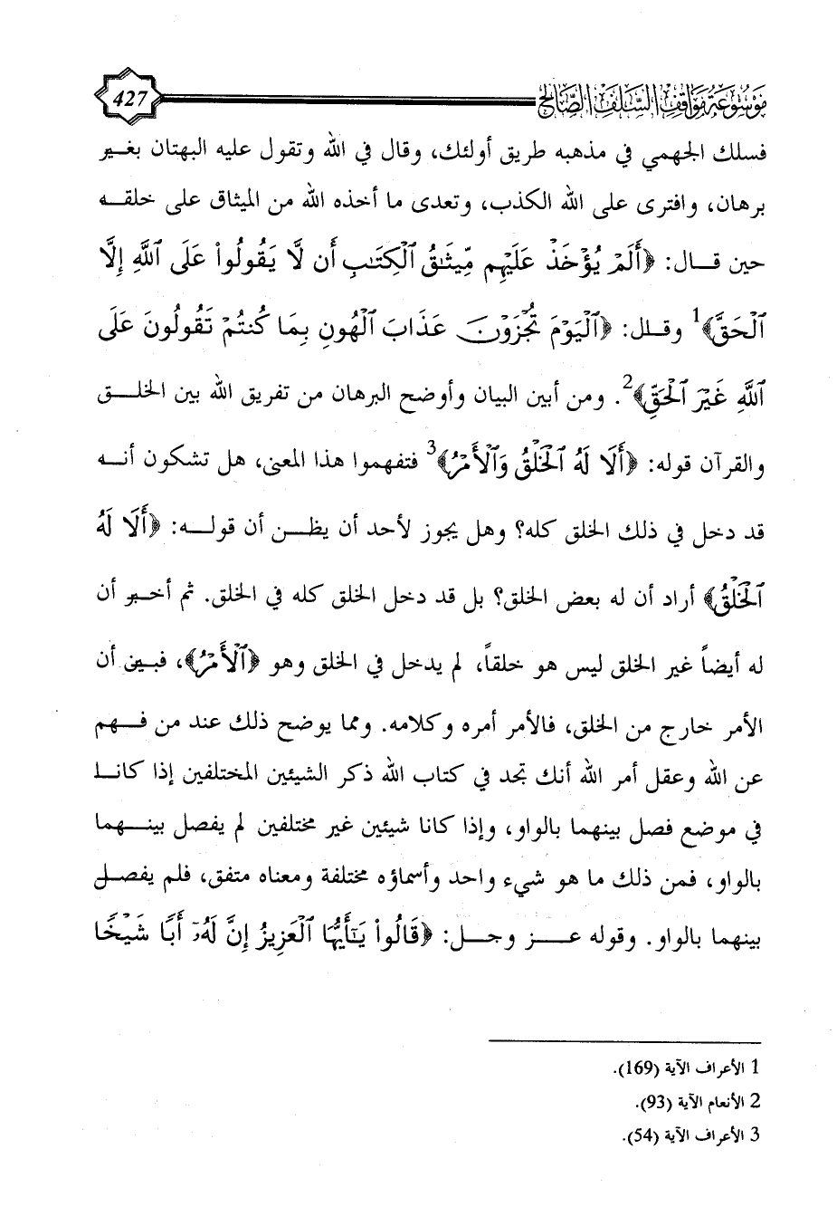 فسلك الجهمي في مذهبه طريق أولئك، وقال في الله وتقول عليه البهتان بغير برهان، وافترى على الله الكذب، وتعدى ما أخذه الله من الميثاق على خلقه حين قال: {أَلَمْ يُؤْخَذْ عَلَيْهِمْ مِيثَاقُ الْكِتَابِ أَنْ لَا يَقُولُوا عَلَى اللَّهِ إِلَّا الْحَقَّ} (¬1) وقال: {الْيَوْمَ تُجْزَوْنَ عَذَابَ الْهُونِ بِمَا كُنْتُمْ تَقُولُونَ عَلَى اللَّهِ غَيْرَ الْحَقِّ} (¬2). ومن أبين البيان وأوضح البرهان من تفريق الله بين الخلق والقرآن قوله: {أَلَا لَهُ الْخَلْقُ وَالْأَمْرُ} (¬3) فتفهموا هذا المعنى، هل تشكون أنه قد دخل في ذلك الخلق كله؟ وهل يجوز لأحد أن يظن أن قوله: {أَلَا لَهُ الْخَلْقُ} أراد أن له بعض الخلق؟ بل قد دخل الخلق كله في الخلق. ثم أخبر أن له أيضاً غير الخلق ليس هو خلقاً، لم يدخل في الخلق وهو {الأمر}، فبين أن الأمر خارج من الخلق، فالأمر أمره وكلامه. ومما يوضح ذلك عند من فهم عن الله وعقل أمر الله أنك تجد في كتاب الله ذكر الشيئين المختلفين إذا كانا في موضع فصل بينهما بالواو، وإذا كانا شيئين غير مختلفين لم يفصل بينهما بالواو، فمن ذلك ما هو شيء واحد وأسماؤه مختلفة ومعناه متفق، فلم يفصل بينهما بالواو. وقوله عز وجل: {قَالُوا يَا أَيُّهَا الْعَزِيزُ إِنَّ لَهُ أَبًا شَيْخًا