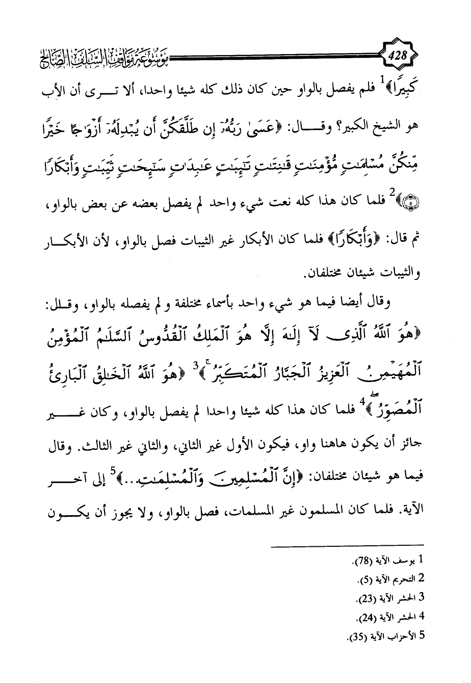 وقال أيضاً فيما هو شيء واحد بأسماء مختلفة ولم يفصله بالواو، وقال: {هُوَ اللَّهُ الَّذِي لَا إِلَهَ إِلَّا هُوَ الْمَلِكُ الْقُدُّوسُ السَّلَامُ الْمُؤْمِنُ الْمُهَيْمِنُ الْعَزِيزُ الْجَبَّارُ الْمُتَكَبِّرُ} (¬3) {هُوَ اللَّهُ الْخَالِقُ الْبَارِئُ الْمُصَوِّرُ} (¬4) فلما كان هذا كله شيئاً واحداً لم يفصل بالواو، وكان غير جائز أن يكون هاهنا واو، فيكون الأول غير الثاني، والثاني غير الثالث. وقال فيما هو شيئان مختلفان: {إِنَّ الْمُسْلِمِينَ والمسلمات .. } (¬5) إلى آخر الآية. فلما كان المسلمون غير المسلمات، فصل بالواو، ولا يجوز أن يكون