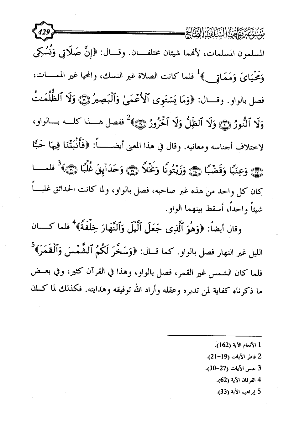 المسلمون المسلمات، لأنهما شيئان مختلفان. وقال: {إِنَّ صَلَاتِي وَنُسُكِي وَمَحْيَايَ وَمَمَاتِي} (¬1) فلما كانت الصلاة غير النسك، والمحيا غير الممات، فصل بالواو. وقال: {وَمَا يَسْتَوِي الْأَعْمَى وَالْبَصِيرُ (19) وَلَا الظُّلُمَاتُ وَلَا النُّورُ (20) وَلَا الظِّلُّ وَلَا الْحَرُورُ (21)} (¬2) ففصل هذا كله بالواو، لاختلاف أجناسه ومعانيه. وقال في هذا المعنى أيضاً: {فَأَنْبَتْنَا فِيهَا حَبًّا (27) وَعِنَبًا وَقَضْبًا (28) وَزَيْتُونًا وَنَخْلًا (29) وحدائق غُلْبًا (30)} (¬3) فلما كان كل واحد من هذه غير صاحبه، فصل بالواو، ولما كانت الحدائق غلباً شيئاً واحداً، أسقط بينهما الواو.