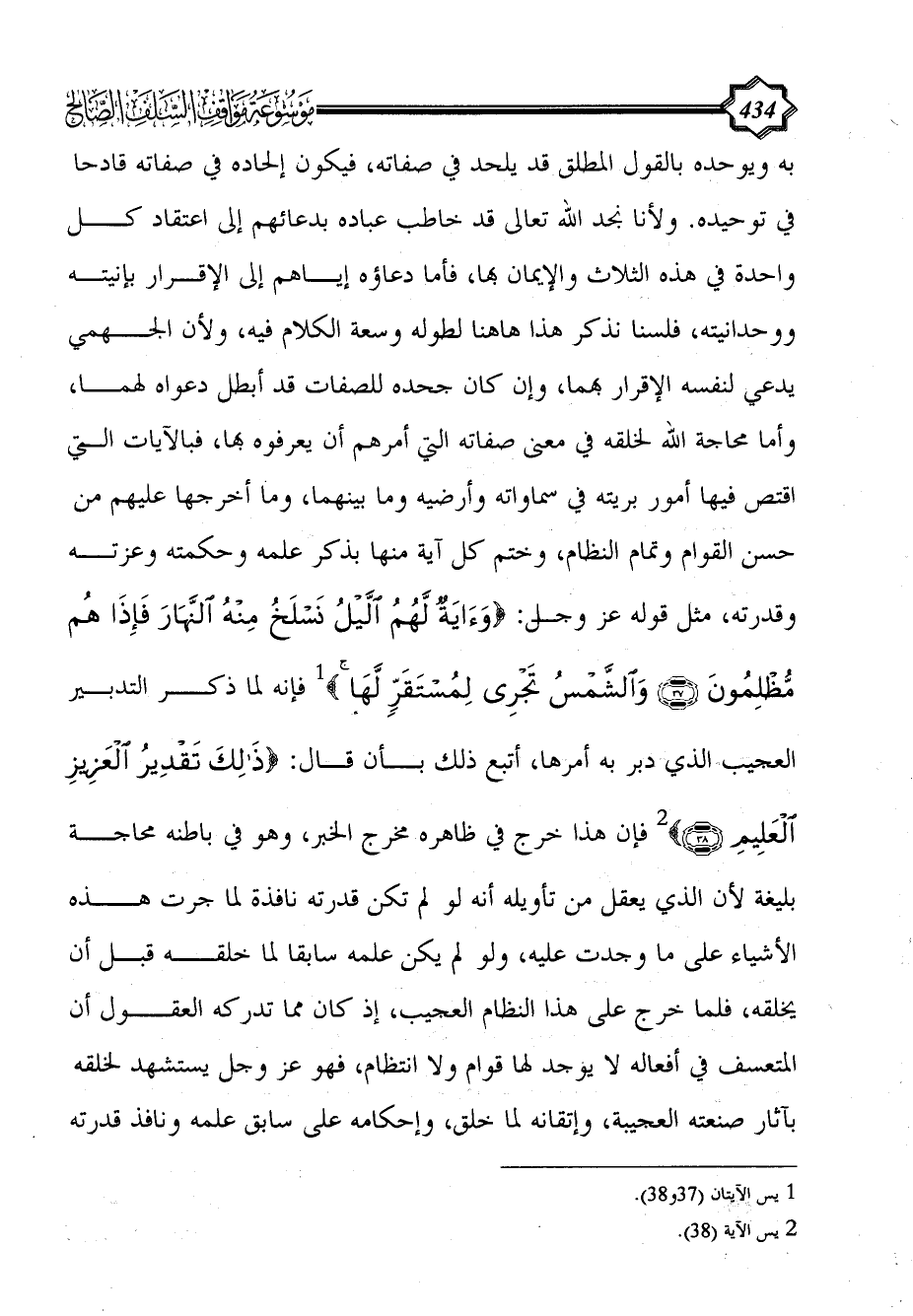 به ويوحده بالقول المطلق قد يلحد في صفاته، فيكون إلحاده في صفاته قادحاً في توحيده. ولأنا نجد الله تعالى قد خاطب عباده بدعائهم إلى اعتقاد كل واحدة في هذه الثلاث والإيمان بها، فأما دعاؤه إياهم إلى الإقرار بإنّيّته ووحدانيته، فلسنا نذكر هذا هاهنا لطوله وسعة الكلام فيه، ولأن الجهمي يدعي لنفسه الإقرار بهما، وإن كان جحده للصفات قد أبطل دعواه لهما، وأما محاجة الله لخلقه في معنى صفاته التي أمرهم أن يعرفوه بها، فبالآيات التي اقتص فيها أمور بريته في سماواته وأرضيه وما بينهما، وما أخرجها عليهم من حسن القوام وتمام النظام، وختم كل آية منها بذكر علمه وحكمته وعزته وقدرته، مثل قوله عز وجل: {وَآَيَةٌ لَهُمُ اللَّيْلُ نَسْلَخُ مِنْهُ النَّهَارَ فَإِذَا هُمْ مُظْلِمُونَ (37) وَالشَّمْسُ تَجْرِي لِمُسْتَقَرٍّ لَهَا} (¬1) فإنه لما ذكر التدبير العجيب الذي دبر به أمرها، أتبع ذلك بأن قال: {ذَلِكَ تَقْدِيرُ الْعَزِيزِ الْعَلِيمِ (38)} (¬2)