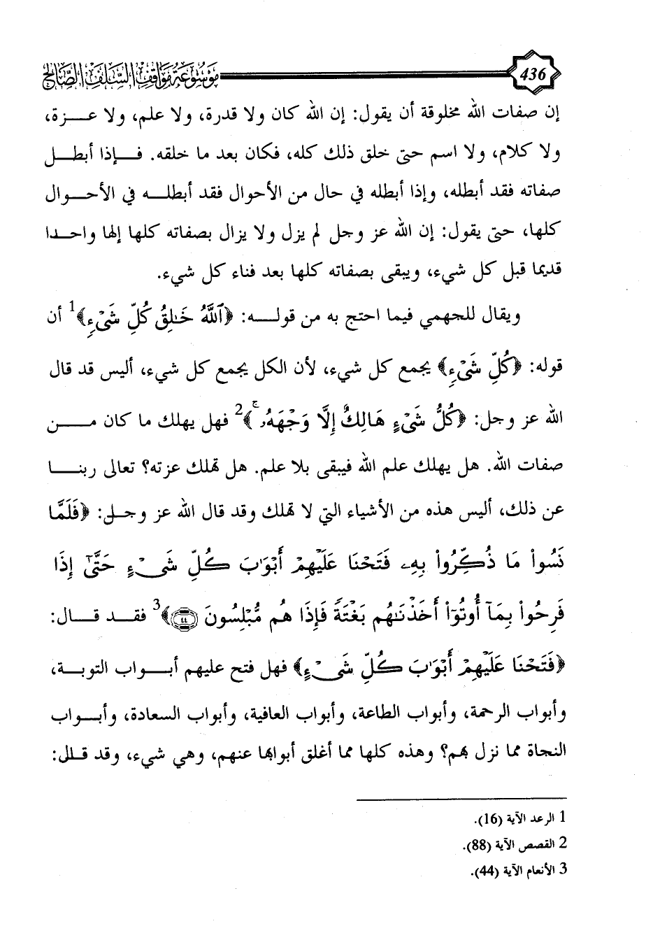 إن صفات الله مخلوقة أن يقول: إن الله كان ولا قدرة، ولا علم، ولا عزة، ولا كلام، ولا اسم حتى خلق ذلك كله، فكان بعد ما خلقه. فإذا أبطل صفاته فقد أبطله، وإذا أبطله في حال من الأحوال فقد أبطله في الأحوال كلها، حتى يقول: إن الله عز وجل لم يزل ولا يزال بصفاته كلها إلهاً واحداً قديماً قبل كل شيء، ويبقى بصفاته كلها بعد فناء كل شيء.