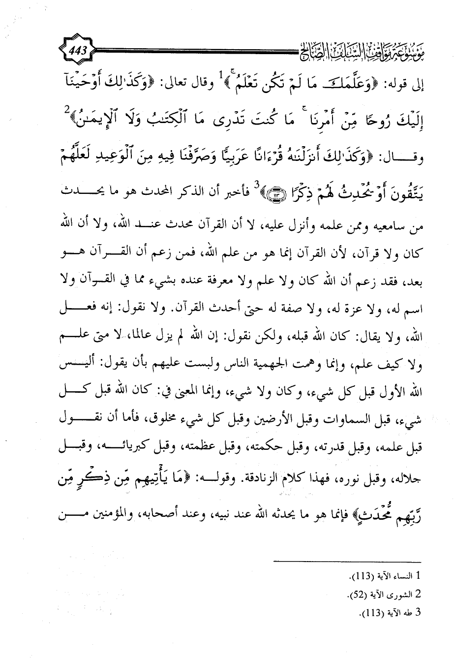وقال: {وَكَذَلِكَ أَنْزَلْنَاهُ قُرْآَنًا عَرَبِيًّا وَصَرَّفْنَا فِيهِ مِنَ الْوَعِيدِ لَعَلَّهُمْ يَتَّقُونَ أَوْ يُحْدِثُ لَهُمْ ذِكْرًا (113)} (¬3) فأخبر أن الذكر المحدث هو ما يحدث من سامعيه وممن علمه وأنزل عليه، لا أن القرآن محدث عند الله، ولا أن الله كان ولا قرآن، لأن القرآن إنما هو من علم الله، فمن زعم أن القرآن هو بعد، فقد زعم أن الله كان ولا علم ولا معرفة عنده بشيء مما في القرآن ولا اسم له، ولا عزة له، ولا صفة له حتى أحدث القرآن. ولا نقول: إنه فعل الله، ولا يقال: كان الله قبله، ولكن نقول: إن الله لم يزل عالما، لا متى علم ولا كيف علم، وإنما وهمت الجهمية الناس ولبست عليهم بأن يقول: أليس الله الأول قبل كل شيء، وكان ولا شيء، وإنما المعنى في: كان الله قبل كل شيء، قبل السماوات وقبل الأرضين وقبل كل شيء مخلوق، فأما أن نقول قبل علمه، وقبل قدرته، وقبل حكمته، وقبل عظمته، وقبل كبريائه، وقبل جلاله، وقبل نوره، فهذا كلام الزنادقة. وقوله: {مَا يَأْتِيهِمْ مِنْ ذِكْرٍ مِنْ رَبِّهِمْ مُحْدَثٍ} فإنما هو ما يحدثه الله عند نبيه، وعند أصحابه، والمؤمنين من