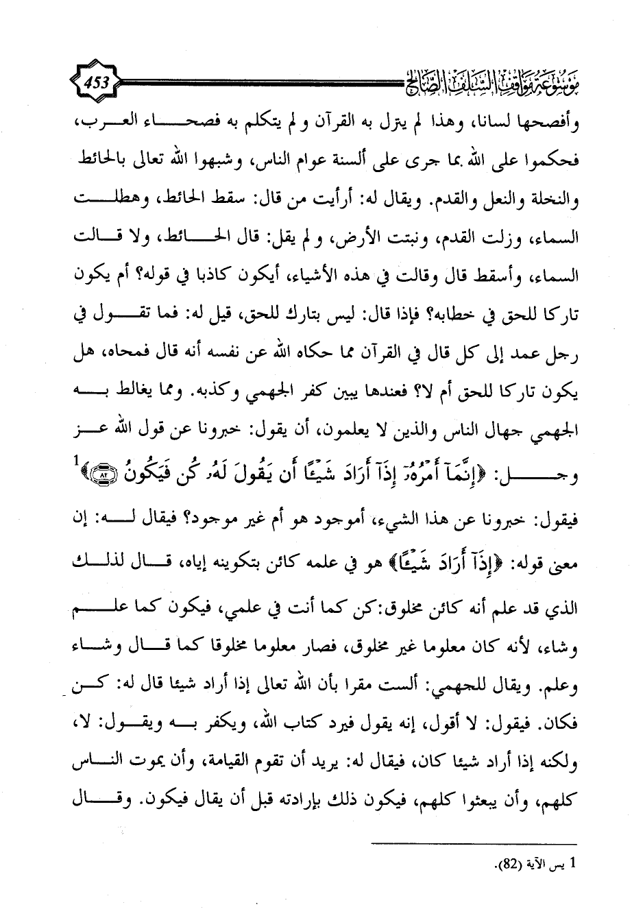 ويقال له: أرأيت من قال: سقط الحائط، وهطلت السماء، وزلت القدم، ونبتت الأرض، ولم يقل: قال الحائط، ولا قالت السماء، وأسقط قال وقالت في هذه الأشياء، أيكون كاذباً في قوله؟ أم يكون تاركاً للحق في خطابه؟ فإذا قال: ليس بتارك للحق، قيل له: فما تقول في رجل عمد إلى كل قال في القرآن مما حكاه الله عن نفسه أنه قال فمحاه، هل يكون تاركاً للحق أم لا؟ فعندها يبين كفر الجهمي وكذبه. ومما يغالط به الجهمي جهال الناس والذين لا يعلمون، أن يقول: خبرونا عن قول الله عز وجل: {إِنَّمَا أَمْرُهُ إِذَا أَرَادَ شَيْئًا أَنْ يَقُولَ لَهُ كُنْ فَيَكُونُ (82)} (¬1) فيقول: خبرونا عن هذا الشيء، أموجود هو أم غير موجود؟ فيقال له: إن معنى قوله: {إِذَا أَرَادَ شَيْئًا} هو في علمه كائن بتكوينه إياه، قال لذلك الذي قد علم أنه كائن مخلوق: كن كما أنت في علمي، فيكون كما علم وشاء، لأنه كان معلوماً غير مخلوق، فصار معلوماً مخلوقاً كما قال وشاء وعلم. ويقال للجهمي: ألست مقراً بأن الله تعالى إذا أراد شيئاً قال له: كن فكان. فيقول: لا أقول، إنه يقول فيرد كتاب الله، ويكفر به ويقول: لا، ولكنه إذا أراد شيئاً كان، فيقال له: يريد أن تقوم القيامة، وأن يموت الناس كلهم، وأن يبعثوا كلهم، فيكون ذلك بإرادته قبل أن يقال فيكون. وقال