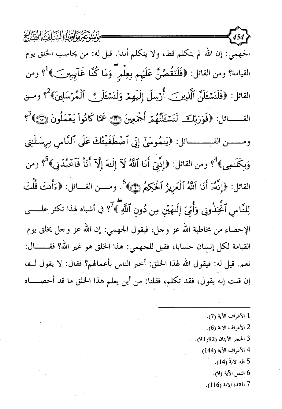 الجهمي: إن الله لم يتكلم قط، ولا يتكلم أبداً. قيل له: من يحاسب الخلق يوم القيامة؟ ومن القائل: {فَلَنَقُصَّنَّ عَلَيْهِمْ بِعِلْمٍ وَمَا كُنَّا غائبين} (¬1)؟ ومن القائل: {فَلَنَسْأَلَنَّ الَّذِينَ أُرْسِلَ إِلَيْهِمْ وَلَنَسْأَلَنَّ الْمُرْسَلِينَ} (¬2)؟ ومن القائل: {فَوَرَبِّكَ لَنَسْأَلَنَّهُمْ أَجْمَعِينَ (92) عَمَّا كَانُوا يَعْمَلُونَ (93)} (¬3)؟