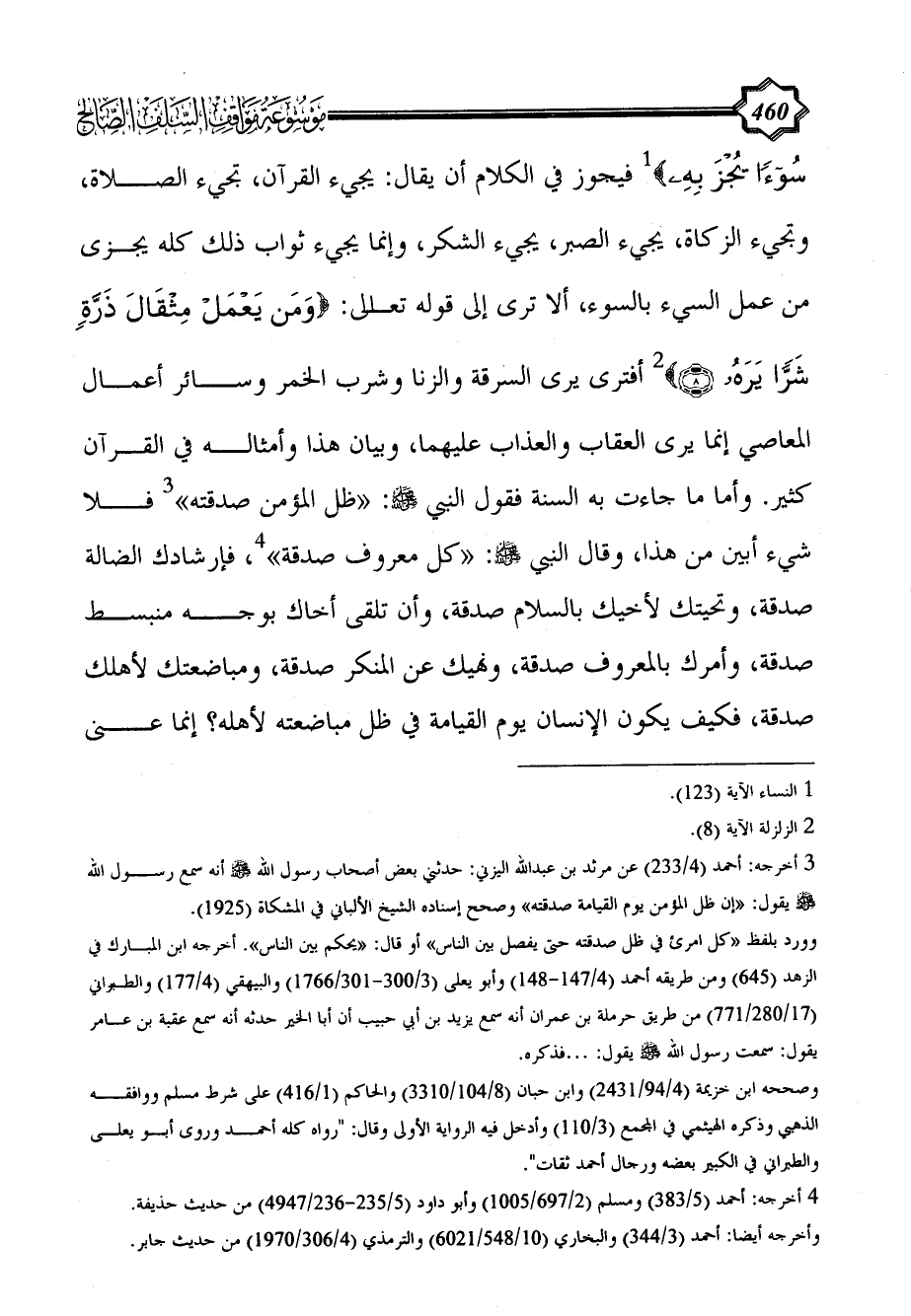 سُوءًا يُجْزَ بِهِ} (¬1) فيجوز في الكلام أن يقال: يجيء القرآن، تجيء الصلاة، وتجيء الزكاة، يجيء الصبر، يجيء الشكر، وإنما يجيء ثواب ذلك كله يجزى من عمل السيء بالسوء، ألا ترى إلى قوله تعالى: {وَمَنْ يَعْمَلْ مِثْقَالَ ذَرَّةٍ شَرًّا يَرَهُ (8)} (¬2) أفترى يرى السرقة والزنا وشرب الخمر وسائر أعمال المعاصي إنما يرى العقاب والعذاب عليهما، وبيان هذا وأمثاله في القرآن كثير. وأما ما جاءت به السنة فقول النبي - صلى الله عليه وسلم -: «ظل المؤمن صدقته» (¬3)