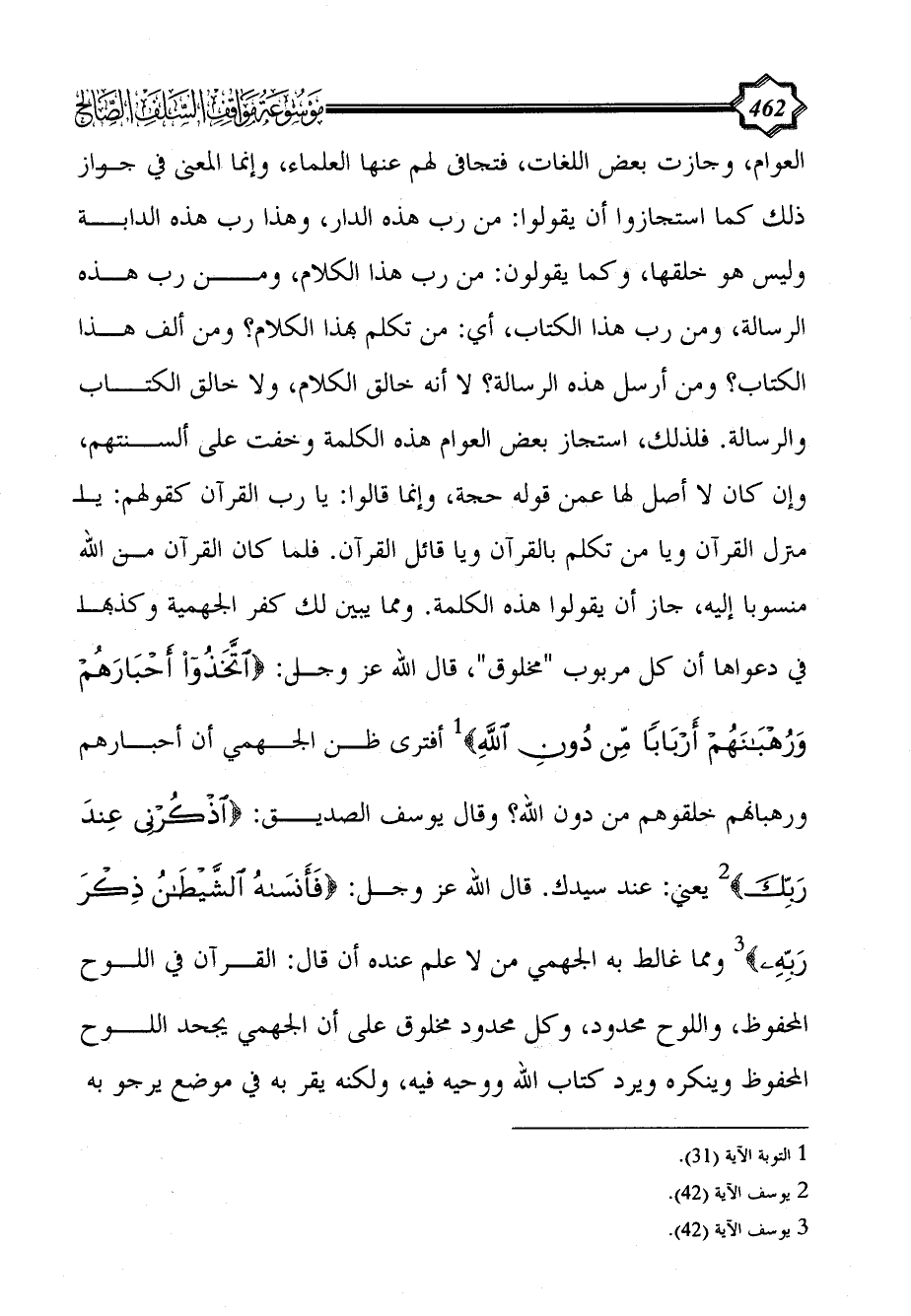 العوام، وجازت بعض اللغات، فتجافى لهم عنها العلماء، وإنما المعنى في جواز ذلك كما استجازوا أن يقولوا: من رب هذه الدار، وهذا رب هذه الدابة وليس هو خلقها، وكما يقولون: من رب هذا الكلام، ومن رب هذه الرسالة، ومن رب هذا الكتاب، أي: من تكلم بهذا الكلام؟ ومن ألف هذا الكتاب؟ ومن أرسل هذه الرسالة؟ لا أنه خالق الكلام، ولا خالق الكتاب والرسالة. فلذلك، استجاز بعض العوام هذه الكلمة وخفت على ألسنتهم، وإن كان لا أصل لها عمن قوله حجة، وإنما قالوا: يا رب القرآن كقولهم: يا منزل القرآن ويا من تكلم بالقرآن ويا قائل القرآن. فلما كان القرآن من الله منسوباً إليه، جاز أن يقولوا هذه الكلمة. ومما يبين لك كفر الجهمية وكذبها في دعواها أن كل مربوب "مخلوق"، قال الله عز وجل: {اتَّخَذُوا أَحْبَارَهُمْ وَرُهْبَانَهُمْ أَرْبَابًا مِنْ دُونِ اللَّهِ} (¬1) أفترى ظن الجهمي أن أحبارهم ورهبانهم خلقوهم من دون الله؟ وقال يوسف الصديق: {اذْكُرْنِي عِنْدَ رَبِّكَ} (¬2) يعني: عند سيدك. قال الله عز وجل: {فَأَنْسَاهُ الشَّيْطَانُ ذِكْرَ رَبِّهِ} (¬3) ومما غالط به الجهمي من لا علم عنده أن قال: القرآن في اللوح المحفوظ، واللوح محدود، وكل محدود مخلوق على أن الجهمي يجحد اللوح المحفوظ وينكره ويرد كتاب الله ووحيه فيه، ولكنه يقر به في موضع يرجو به