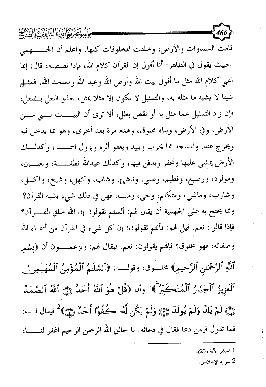 واعلم أن الجهمي الخبيث يقول في الظاهر: أنا أقول إن القرآن كلام الله، فإذا نصصته، قال: إنما أعني كلام الله مثل ما أقول بيت الله وأرض الله وعبد الله ومسجد الله، فمثل شيئاً لا يشبه ما مثله به، والتمثيل لا يكون إلا مثلاً بمثل، حذو النعل بالنعل، فإن زاد التمثيل عما مثل به أو نقص بطل، ألا ترى أن البيت بني من الأرض، وفي الأرض، وبناه مخلوق، وهدم مرة بعد أخرى، وهو مما يدخل فيه ويخرج عنه، والمسجد مما يخرب ويبيد ويعفو أثره ويزول اسمه، وكذلك الأرض يمشى عليها وتحفر ويدفن فيها، وكذلك عبد الله نطفة، وجنين، ومولود، ورضيع، وفطيم، وصبي، وناشئ، وشاب، وكهل، وشيخ، وآكل، وشارب، وماشي، ومتكلم، وحي، وميت، فهل في ذلك شيء يشبه القرآن؟ ومما يحتج به على الجهمية أن يقال لهم: ألستم تقولون إن الله خلق القرآن؟ فإذا قالوا: نعم. قيل لهم: فأنتم تقولون: إن كل شيء في القرآن من أسماء الله وصفاته، فهو مخلوق؟ فإنهم يقولون: نعم. فيقال لهم: وتزعمون أن {بِسْمِ اللَّهِ الرَّحْمَنِ الرَّحِيمِ} مخلوق، وقوله: {السَّلَامُ الْمُؤْمِنُ الْمُهَيْمِنُ الْعَزِيزُ الْجَبَّارُ الْمُتَكَبِّرُ} (¬1) وأن {قُلْ هُوَ اللَّهُ أَحَدٌ (1) اللَّهُ الصَّمَدُ (2) لَمْ يَلِدْ وَلَمْ يُولَدْ (3) وَلَمْ يَكُنْ لَهُ كُفُوًا أَحَد (4)} (¬2)