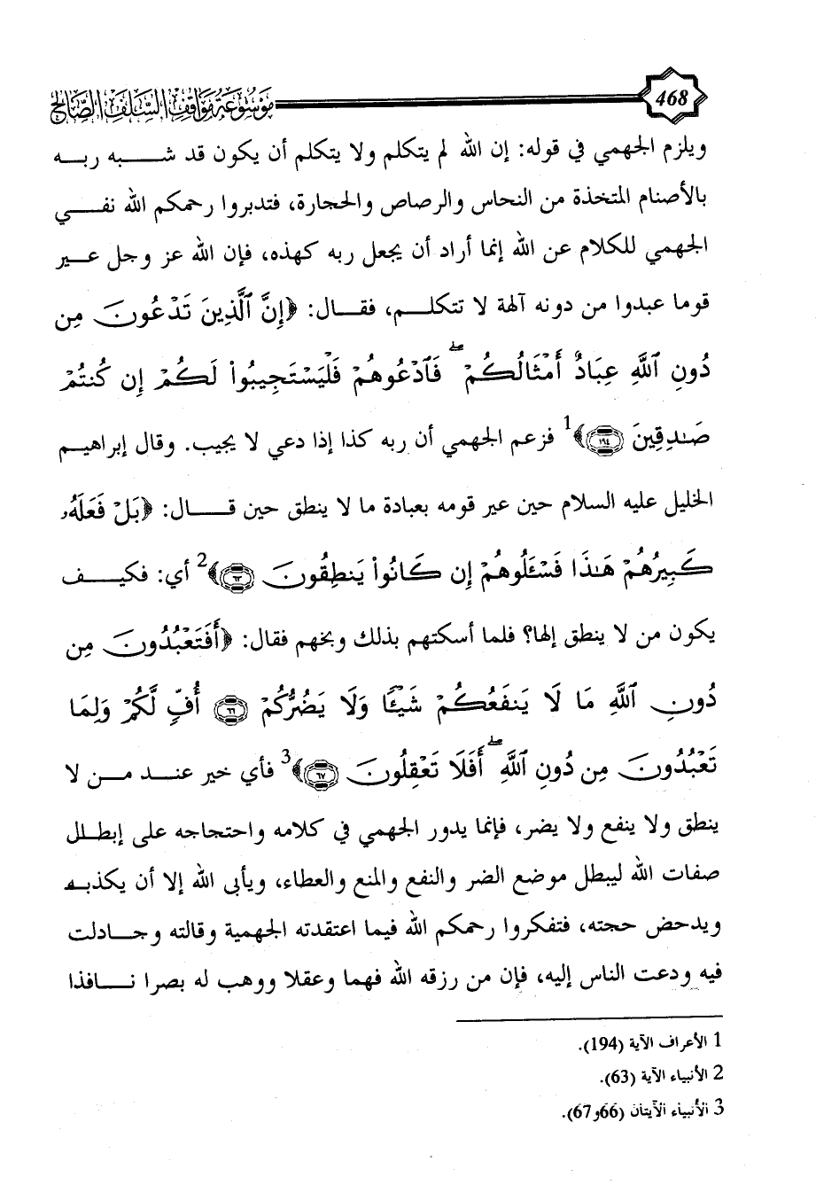 ويلزم الجهمي في قوله: إن الله لم يتكلم ولا يتكلم أن يكون قد شبه ربه بالأصنام المتخذة من النحاس والرصاص والحجارة، فتدبروا رحمكم الله نفي الجهمي للكلام عن الله إنما أراد أن يجعل ربه كهذه، فإن الله عز وجل عير قوماً عبدوا من دونه آلهة لا تتكلم، فقال: {إِنَّ الَّذِينَ تَدْعُونَ مِنْ دُونِ اللَّهِ عِبَادٌ أَمْثَالُكُمْ فَادْعُوهُمْ فَلْيَسْتَجِيبُوا لَكُمْ إِنْ كُنْتُمْ صَادِقِينَ (194)} (¬1) فزعم الجهمي أن ربه كذا إذا دعي لا يجيب. وقال إبراهيم الخليل عليه السلام حين عير قومه بعبادة ما لا ينطق حين قال: {بَلْ فَعَلَهُ كَبِيرُهُمْ هَذَا فَاسْأَلُوهُمْ إِنْ كَانُوا يَنْطِقُونَ (63)} (¬2) أي: فكيف يكون من لا ينطق إلهاً؟ فلما أسكتهم بذلك وبخهم فقال: {أَفَتَعْبُدُونَ مِنْ دُونِ اللَّهِ مَا لَا يَنْفَعُكُمْ شَيْئًا وَلَا يَضُرُّكُمْ (66) أُفٍّ لَكُمْ وَلِمَا تَعْبُدُونَ مِنْ دُونِ اللَّهِ أَفَلَا تَعْقِلُونَ (67)} (¬3)