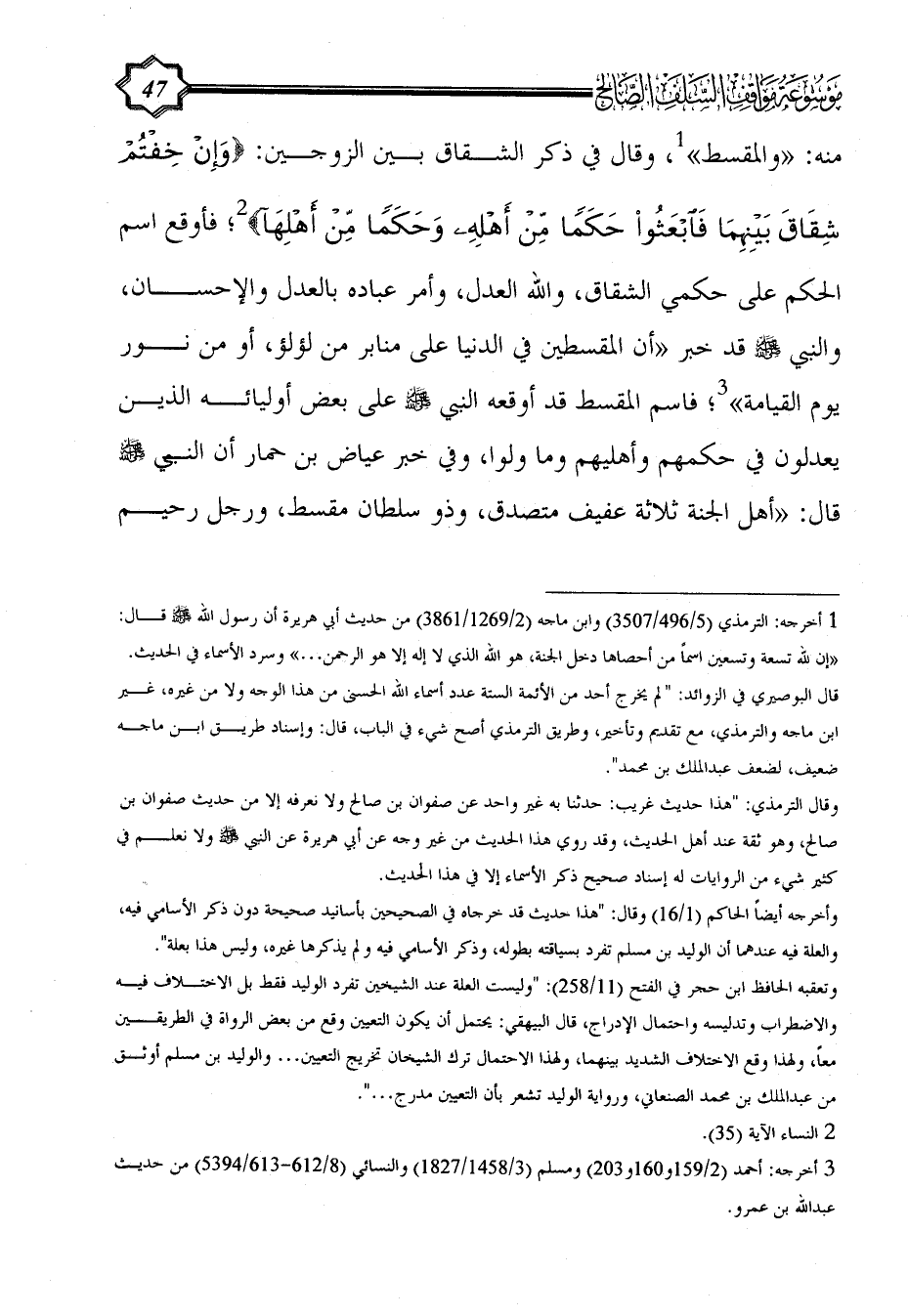 وقال في ذكر الشقاق بين الزوجين: {وَإِنْ خِفْتُمْ شِقَاقَ بَيْنِهِمَا فَابْعَثُوا حَكَمًا مِنْ أَهْلِهِ وَحَكَمًا مِنْ أَهْلِهَا} (¬2)؛ فأوقع اسم الحكم على حكمي الشقاق، والله العدل، وأمر عباده بالعدل والإحسان، والنبي - صلى الله عليه وسلم - قد خبر "أن المقسطين في الدنيا على منابر من لؤلؤ، أو من نور يوم القيامة" (¬3)؛ فاسم المقسط قد أوقعه النبي - صلى الله عليه وسلم - على بعض أوليائه الذين يعدلون في حكمهم وأهليهم وما ولوا، وفي خبر عياض بن حمار أن النبي - صلى الله عليه وسلم - قال: "أهل الجنة ثلاثة عفيف متصدق، وذو سلطان مقسط، ورجل رحيم