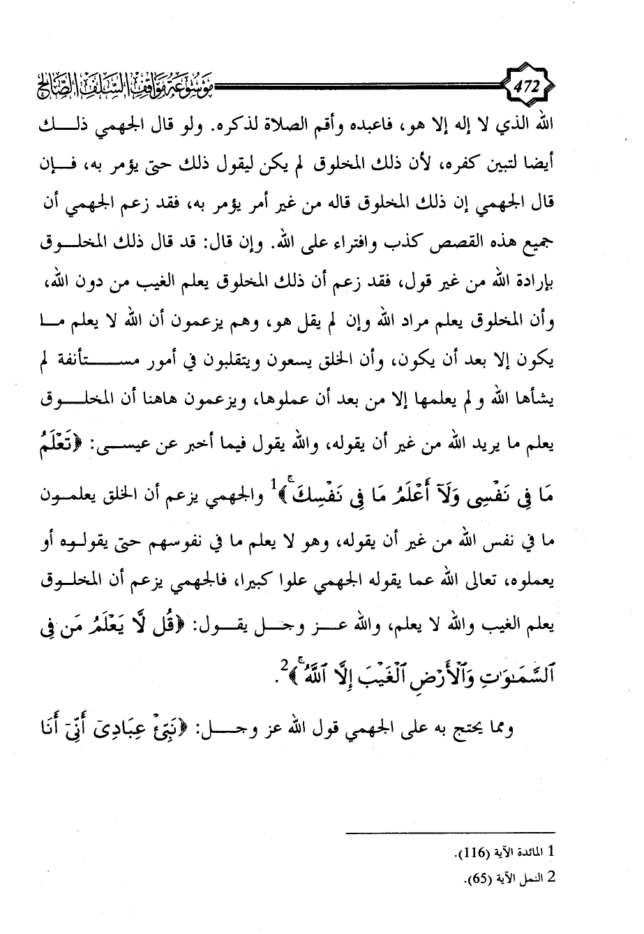 الله الذي لا إله إلا هو، فاعبده وأقم الصلاة لذكره. ولو قال الجهمي ذلك أيضاً لتبين كفره، لأن ذلك المخلوق لم يكن ليقول ذلك حتى يؤمر به، فإن قال الجهمي إن ذلك المخلوق قاله من غير أمر يؤمر به، فقد زعم الجهمي أن جميع هذه القصص كذب وافتراء على الله. وإن قال: قد قال ذلك المخلوق بإرادة الله من غير قول، فقد زعم أن ذلك المخلوق يعلم الغيب من دون الله، وأن المخلوق يعلم مراد الله وإن لم يقل هو، وهم يزعمون أن الله لا يعلم ما يكون إلا بعد أن يكون، وأن الخلق يسعون ويتقلبون في أمور مستأنفة لم يشأها الله ولم يعلمها إلا من بعد أن عملوها، ويزعمون هاهنا أن المخلوق يعلم ما يريد الله من غير أن يقوله، والله يقول فيما أخبر عن عيسى: {تَعْلَمُ مَا فِي نَفْسِي وَلَا أَعْلَمُ مَا فِي نَفْسِكَ} (¬1) والجهمي يزعم أن الخلق يعلمون ما في نفس الله من غير أن يقوله، وهو لا يعلم ما في نفوسهم حتى يقولوه أو يعملوه، تعالى الله عما يقوله الجهمي علوّاً كبيراً، فالجهمي يزعم أن المخلوق يعلم الغيب والله لا يعلم، والله عز وجل يقول: {قُلْ لَا يَعْلَمُ مَنْ فِي السَّمَاوَاتِ وَالْأَرْضِ الْغَيْبَ إِلَّا اللَّهُ} (¬2).