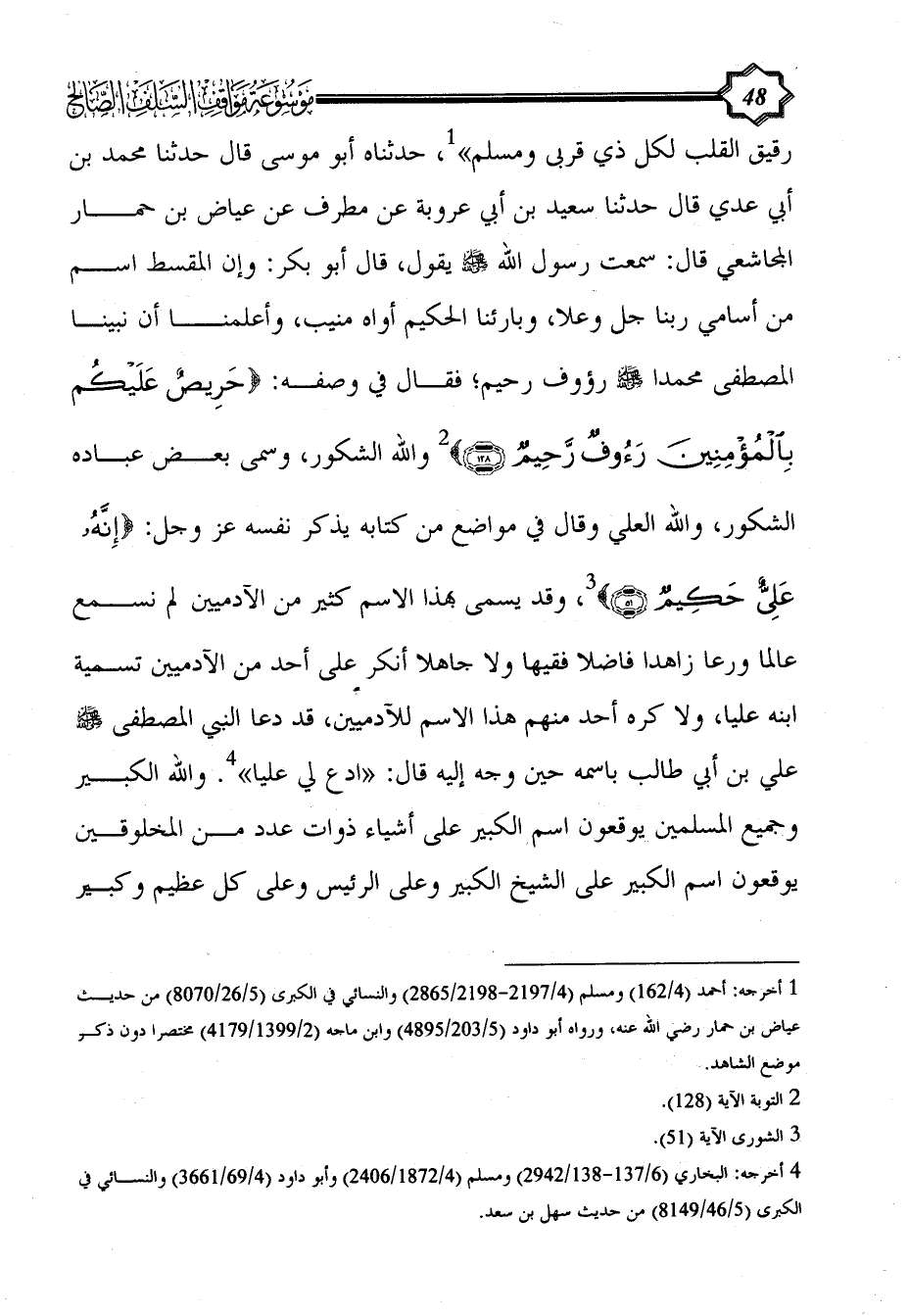 رقيق القلب لكل ذي قربى ومسلم" (¬1)، حدثناه أبو موسى قال حدثنا محمد بن أبي عدي قال حدثنا سعيد بن أبي عروبة عن مطرف عن عياض بن حمار المجاشعي قال: سمعت رسول الله - صلى الله عليه وسلم - يقول، قال أبو بكر: وإن المقسط اسم من أسامي ربنا جل وعلا، وبارئنا الحكيم أواه منيب، وأعلمنا أن نبينا المصطفى محمداً - صلى الله عليه وسلم - رؤوف رحيم؛ فقال في وصفه: {حَرِيصٌ عَلَيْكُمْ بِالْمُؤْمِنِينَ رَءُوفٌ رَحِيمٌ} (¬2) والله الشكور، وسمى بعض عباده الشكور، والله العلي وقال في مواضع من كتابه يذكر نفسه عز وجل: {إِنَّهُ عليٌّ حكيمٌ} (¬3)،وقد يسمى بهذا الاسم كثير من الآدميين لم نسمع عالماً ورعاً زاهداً فاضلاً فقيهاً ولا جاهلاً أنكر على أحد من الآدميين تسمية ابنه عليّاً، ولا كره أحد منهم هذا الاسم للآدميين، قد دعا النبي المصطفى - صلى الله عليه وسلم - علي بن أبي طالب باسمه حين وجه إليه قال: "ادع لي عليّاً" (¬4). والله الكبير وجميع المسلمين يوقعون اسم الكبير على أشياء ذوات عدد من المخلوقين يوقعون اسم الكبير على الشيخ الكبير وعلى الرئيس وعلى كل عظيم وكبير