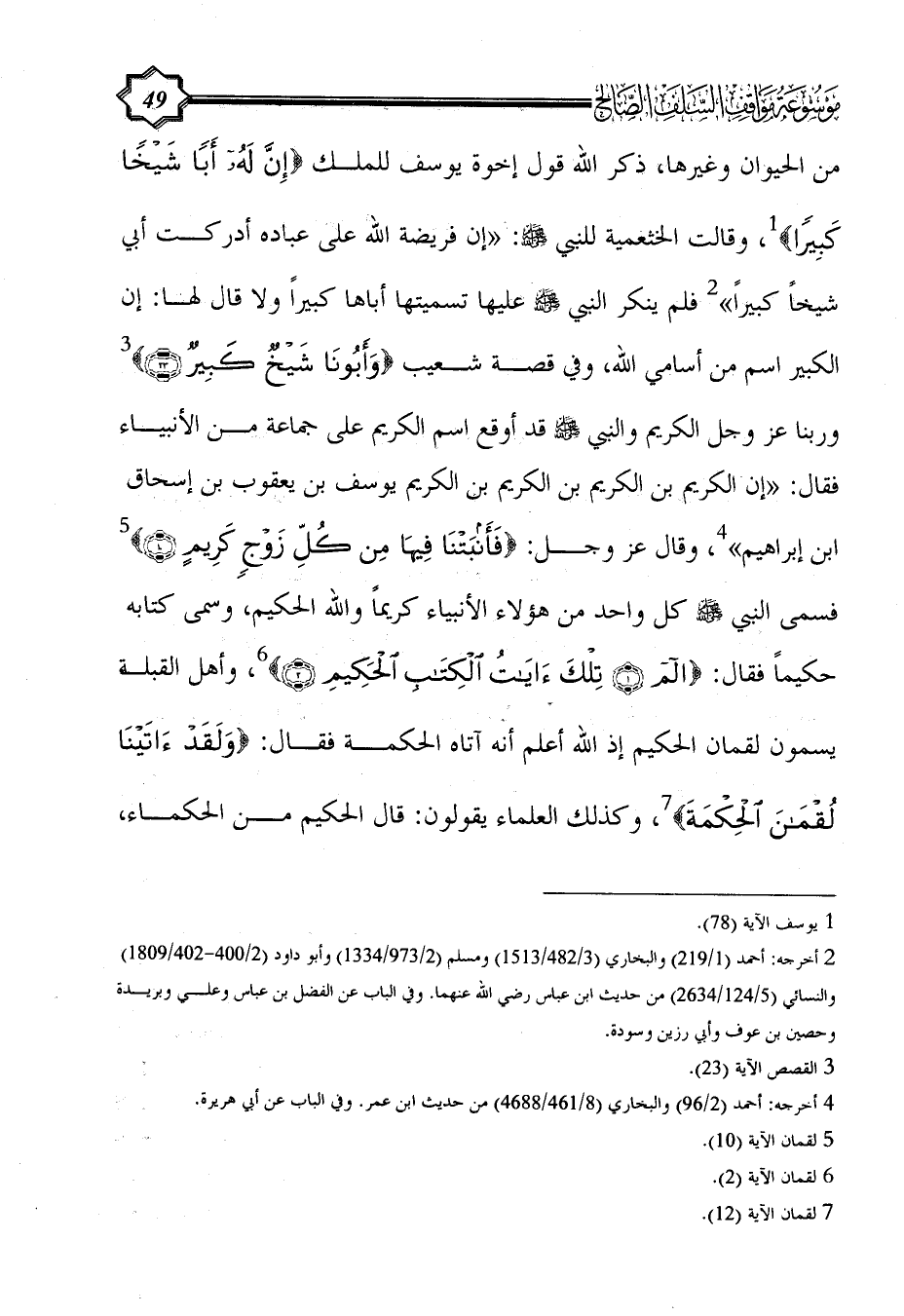 من الحيوان وغيرها، ذكر الله قول إخوة يوسف للملك {إِنَّ لَهُ أَبًا شيخًا كبيرًا} (¬1)، وقالت الخثعمية للنبي - صلى الله عليه وسلم -: "إن فريضة الله على عباده أدركت أبي شيخاً كبيراً" (¬2) فلم ينكر النبي - صلى الله عليه وسلم - عليها تسميتها أباها كبيراً ولا قال لها: إن الكبير اسم من أسامي الله، وفي قصة شعيب {وَأَبُونَا شيخٌ كبيرٌ} (¬3) وربنا عز وجل الكريم والنبي - صلى الله عليه وسلم - قد أوقع اسم الكريم على جماعة من الأنبياء فقال: "إن الكريم بن الكريم بن الكريم بن الكريم يوسف بن يعقوب بن إسحاق ابن إبراهيم" (¬4)، وقال عز وجل: {فَأَنْبَتْنَا فِيهَا مِنْ كُلِّ زَوْجٍ كَرِيمٍ} (¬5) فسمى النبي - صلى الله عليه وسلم - كل واحد من هؤلاء الأنبياء كريماً والله الحكيم، وسمى كتابه حكيماً فقال: {الم (1) تِلْكَ آيَاتُ الْكِتَابِ الْحَكِيمِ} (¬6)، وأهل القبلة يسمون لقمان الحكيم إذ الله أعلم أنه آتاه الحكمة فقال: {وَلَقَدْ آتَيْنَا لُقْمَانَ الْحِكْمَةَ} (¬7)، وكذلك العلماء يقولون: قال الحكيم من الحكماء،