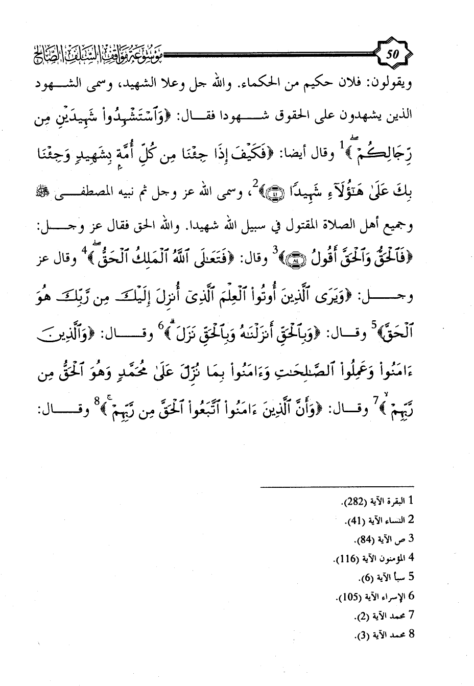 ويقولون: فلان حكيم من الحكماء. والله جل وعلا الشهيد، وسمى الشهود الذين يشهدون على الحقوق شهوداً فقال: {وَاسْتَشْهِدُوا شَهِيدَيْنِ مِنْ رِجَالِكُمْ} (¬1) وقال أيضاً: {فَكَيْفَ إِذَا جِئْنَا مِنْ كُلِّ أُمَّةٍ بِشَهِيدٍ وَجِئْنَا بِكَ عَلَى هَؤُلَاءِ شَهِيدًا} (¬2)، وسمى الله عز وجل ثم نبيه المصطفى - صلى الله عليه وسلم - وجميع أهل الصلاة المقتول في سبيل الله شهيداً. والله الحق فقال عز وجل: {فالحق وَالْحَقَّ أَقُولُ} (¬3) وقال: {فتعالى اللَّهُ الْمَلِكُ الحق} (¬4) وقال عز وجل: {وَيَرَى الَّذِينَ أُوتُوا الْعِلْمَ الَّذِي أُنْزِلَ إِلَيْكَ مِنْ رَبِّكَ هُوَ الْحَقَّ} (¬5) وقال: {وَبِالْحَقِّ أنزلناه وَبِالْحَقِّ نزل} (¬6) وقال: {وَالَّذِينَ آمَنُوا وَعَمِلُوا الصَّالِحَاتِ وَآمَنُوا بِمَا نُزِّلَ عَلَى مُحَمَّدٍ وَهُوَ الْحَقُّ مِنْ رَبِّهِمْ} (¬7) وقال: {وَأَنَّ الَّذِينَ آمَنُوا اتَّبَعُوا الْحَقَّ مِنْ رَبِّهِمْ} (¬8) وقال: