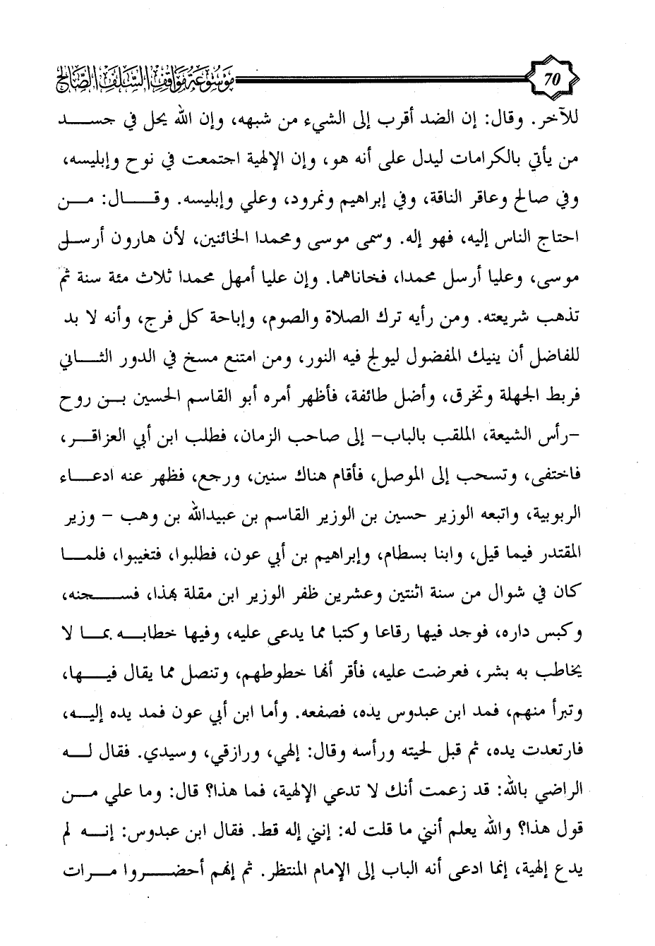 للآخر. وقال: إن الضد أقرب إلى الشيء من شبهه، وإن الله يحل في جسد من يأتي بالكرامات ليدل على أنه هو، وإن الإلهية اجتمعت في نوح وإبليسه، وفي صالح وعاقر الناقة، وفي إبراهيم ونمرود، وعلي وإبليسه. وقال: من احتاج الناس إليه، فهو إله. وسمى موسى ومحمداً الخائنين، لأن هارون أرسل موسى، وعلياً أرسل محمداً، فخاناهما. وإن علياً أمهل محمداً ثلاث مئة سنة ثم تذهب شريعته. ومن رأيه ترك الصلاة والصوم، وإباحة كل فرج، وأنه لا بد للفاضل أن يَنِيكَ المفضول ليولج فيه النور، ومن امتنع مسخ في الدور الثاني فربط الجهلة وتخرق، وأضل طائفة، فأظهر أمره أبو القاسم الحسين بن روح -رأس الشيعة، الملقب بالباب- إلى صاحب الزمان، فطلب ابن أبي العزاقر، فاختفى، وتسحب إلى الموصل، فأقام هناك سنين، ورجع، فظهر عنه ادعاء الربوبية، واتبعه الوزير حسين بن الوزير القاسم بن عبيد الله بن وهب - وزير المقتدر فيما قيل، وابنا بسطام، وإبراهيم بن أبي عون، فطلبوا، فتغيبوا، فلما كان في شوال من سنة اثنتين وعشرين ظفر الوزير ابن مقلة بهذا، فسجنه، وكبس داره، فوجد فيها رقاعاً وكتباً مما يدعى عليه، وفيها خطابه بما لا يخاطب به بشر، فعرضت عليه، فأقر أنها خطوطهم، وتنصل مما يقال فيها، وتبرأ منهم، فمد ابن عبدوس يده، فصفعه. وأما ابن أبي عون فمد يده إليه، فارتعدت يده، ثم قبل لحيته ورأسه وقال: إلهي، ورازقي، وسيدي. فقال له الراضي بالله: قد زعمت أنك لا تدعي الإلهية، فما هذا؟ قال: وما علي من قول هذا؟ والله يعلم أنني ما قلت له: إنني إله قط. فقال ابن عبدوس: إنه لم يدع إلهية، إنما ادعى أنه الباب إلى الإمام المنتظر.