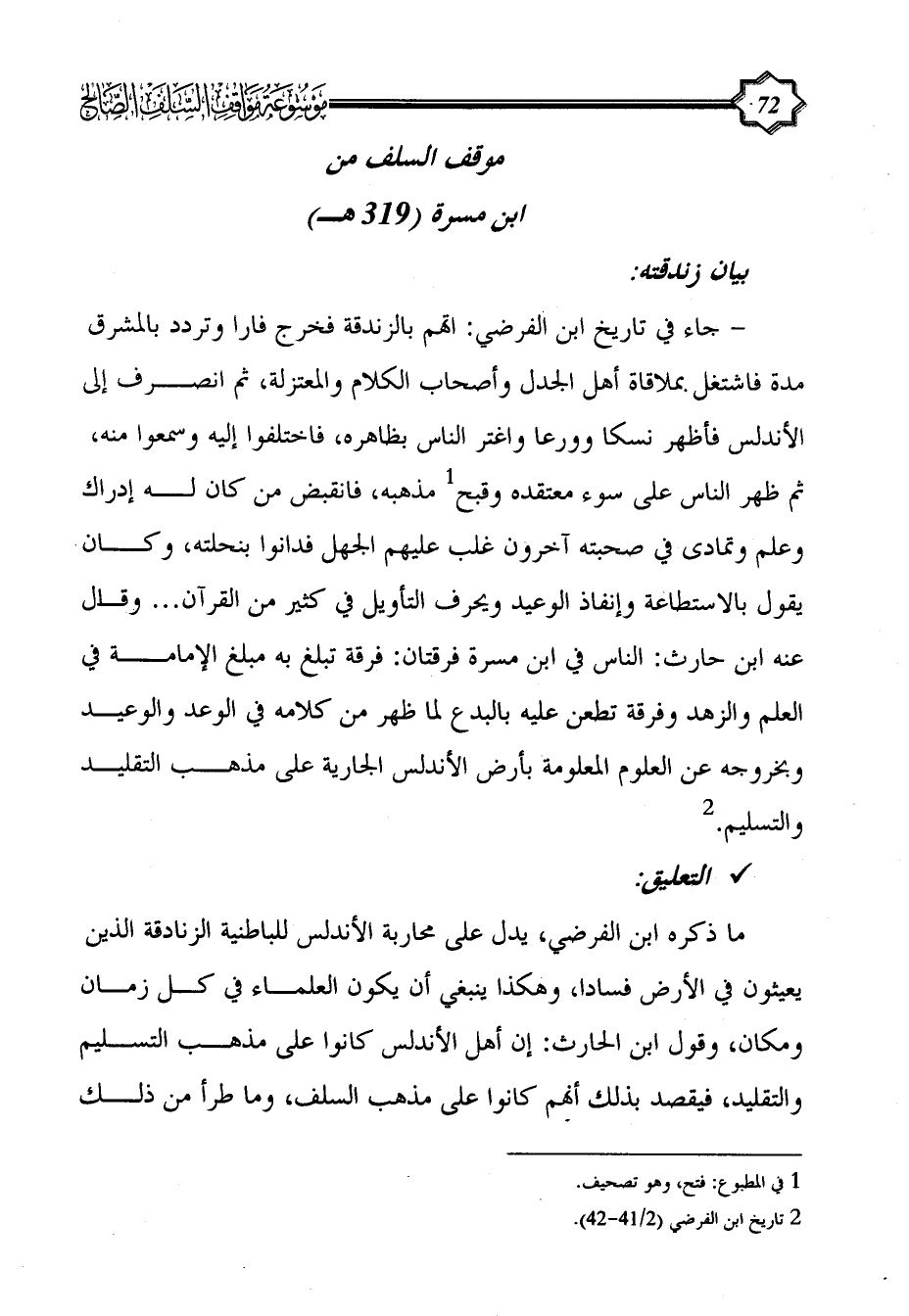 ما ذكره ابن الفرضي، يدل على محاربة الأندلس للباطنية الزنادقة الذين يعيثون في الأرض فساداً، وهكذا ينبغي أن يكون العلماء في كل زمان ومكان، وقول ابن الحارث: إن أهل الأندلس كانوا على مذهب التسليم والتقليد، فيقصد بذلك أنهم كانوا على مذهب السلف، وما طرأ من ذلك
