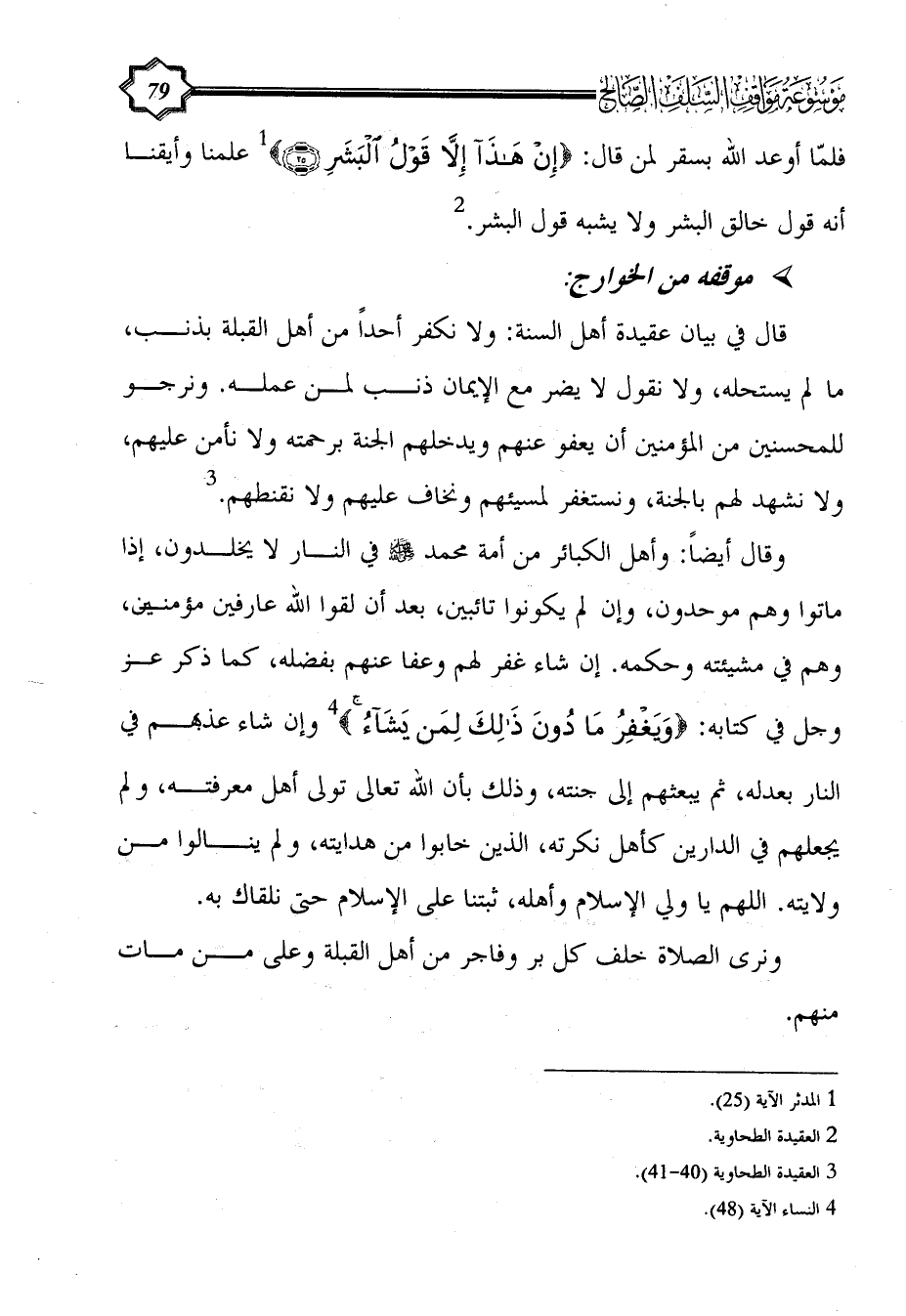 قال في بيان عقيدة أهل السنة: ولا نكفر أحداً من أهل القبلة بذنب، ما لم يستحله، ولا نقول لا يضر مع الإيمان ذنب لمن عمله. ونرجو للمحسنين من المؤمنين أن يعفو عنهم ويدخلهم الجنة برحمته ولا نأمن عليهم، ولا نشهد لهم بالجنة، ونستغفر لمسيئهم ونخاف عليهم ولا نقنطهم. (¬3)