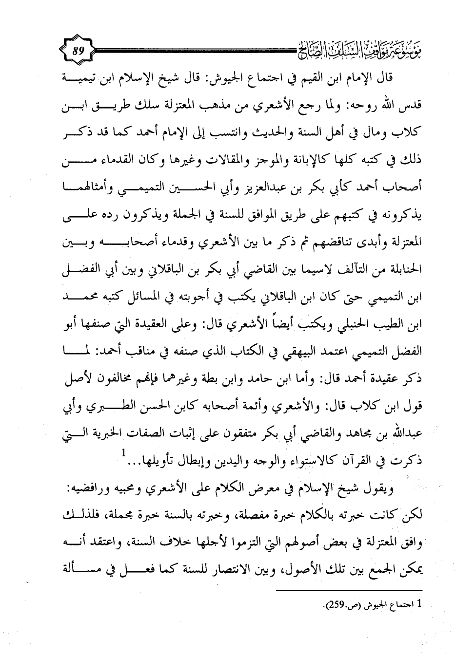 قال الإمام ابن القيم في اجتماع الجيوش: قال شيخ الإسلام ابن تيمية قدس الله روحه: ولما رجع الأشعري من مذهب المعتزلة سلك طريق ابن كلاب ومال في أهل السنة والحديث وانتسب إلى الإمام أحمد كما قد ذكر ذلك في كتبه كلها كالإبانة والموجز والمقالات وغيرها وكان القدماء من أصحاب أحمد كأبي بكر بن عبد العزيز وأبي الحسين التميمي وأمثالهما يذكرونه في كتبهم على طريق الموافق للسنة في الجملة ويذكرون رده على المعتزلة وأبدى تناقضهم ثم ذكر ما بين الأشعري وقدماء أصحابه وبين الحنابلة من التآلف لاسيما بين القاضي أبي بكر بن الباقلاني وبين أبي الفضل ابن التميمي حتى كان ابن الباقلاني يكتب في أجوبته في المسائل كتبه محمد ابن الطيب الحنبلي ويكتب أيضاً الأشعري قال: وعلى العقيدة التي صنفها أبو الفضل التميمي اعتمد البيهقي في الكتاب الذي صنفه في مناقب أحمد: لما ذكر عقيدة أحمد قال: وأما ابن حامد وابن بطة وغيرهما فإنهم مخالفون لأصل قول ابن كلاب قال: والأشعري وأئمة أصحابه كابن الحسن الطبري وأبي عبد الله بن مجاهد والقاضي أبي بكر متفقون على إثبات الصفات الخبرية التي ذكرت في القرآن كالاستواء والوجه واليدين وإبطال تأويلها ... (¬1)