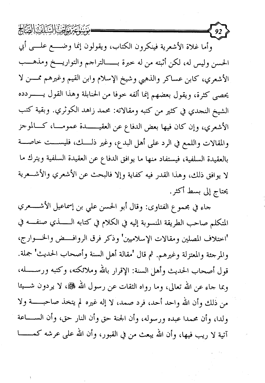 جاء في مجموع الفتاوى: وقال أبو الحسن علي بن إسماعيل الأشعري المتكلم صاحب الطريقة المنسوبة إليه في الكلام في كتابه الذي صنفه في 'اختلاف المصلين ومقالات الإسلاميين' وذكر فرق الروافض والخوارج، والمرجئة والمعتزلة وغيرهم. ثم قال 'مقالة أهل السنة وأصحاب الحديث' جملة. قول أصحاب الحديث وأهل السنة: الإقرار بالله وملائكته، وكتبه ورسله، وبما جاء عن الله تعالى، وما رواه الثقات عن رسول الله - صلى الله عليه وسلم -، لا يردون شيئاً من ذلك وأن الله واحد أحد، فرد صمد، لا إله غيره لم يتخذ صاحبة ولا ولداً، وأن محمداً عبده ورسوله، وأن الجنة حق وأن النار حق، وأن الساعة آتية لا ريب فيها، وأن الله يبعث من في القبور، وأن الله على عرشه كما