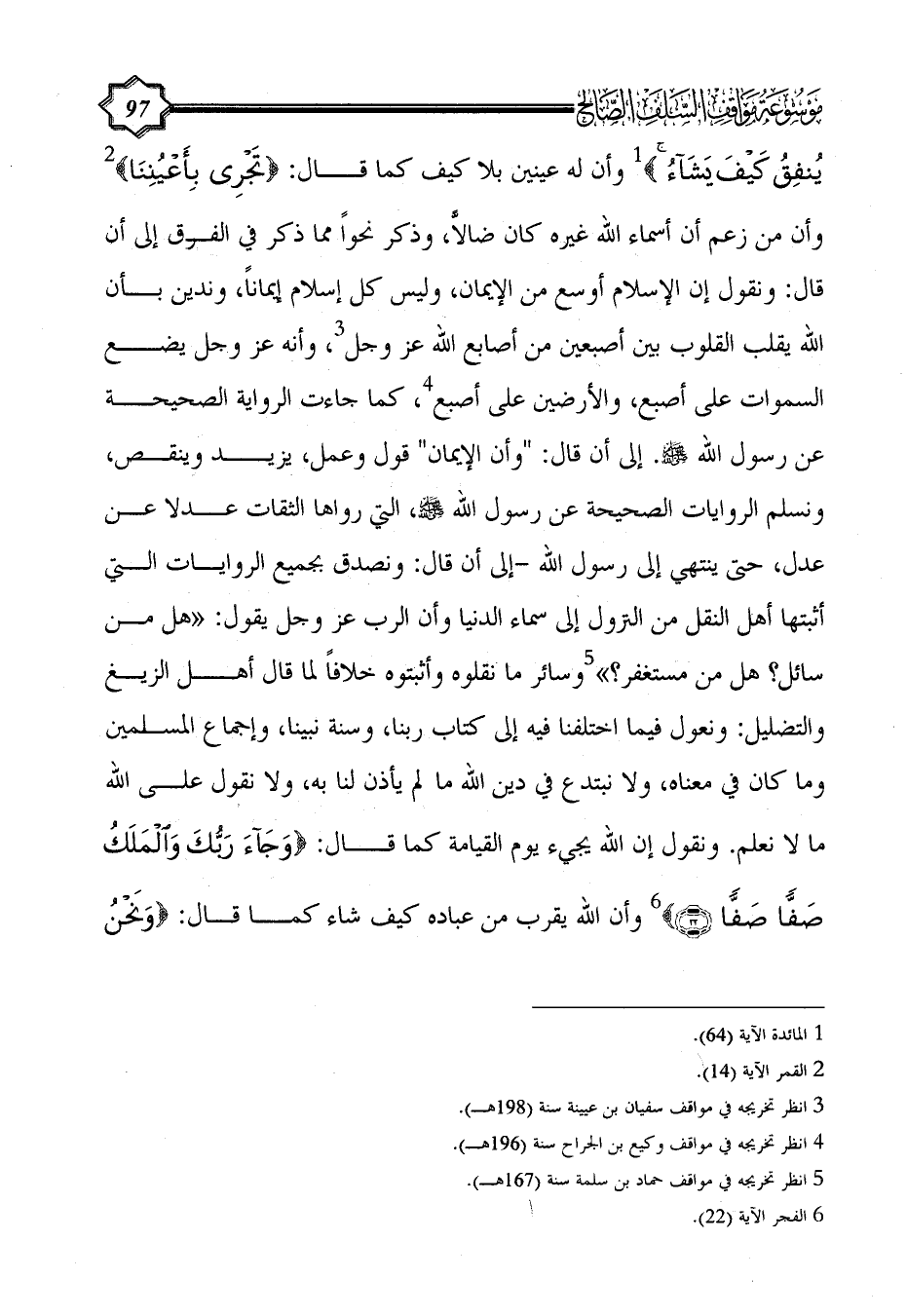 ينفق كيف يشاء} (¬1) وأن له عينين بلا كيف كما قال: {تجري بأعيننا} (¬2) وأن من زعم أن أسماء الله غيره كان ضالاًّ، وذكر نحواً مما ذكر في الفرق إلى أن قال: ونقول إن الإسلام أوسع من الإيمان، وليس كل إسلام إيماناً، وندين بأن الله يقلب القلوب بين أصبعين من أصابع الله عز وجل (¬3)، وأنه عز وجل يضع السموات على أصبع، والأرضين على أصبع (¬4)، كما جاءت الرواية الصحيحة عن رسول الله - صلى الله عليه وسلم -. إلى أن قال: "وأن الإيمان" قول وعمل، يزيد وينقص، ونسلم الروايات الصحيحة عن رسول الله - صلى الله عليه وسلم -، التي رواها الثقات عدلا عن عدل، حتى ينتهي إلى رسول الله -إلى أن قال: ونصدق بجميع الروايات التي أثبتها أهل النقل من النزول إلى سماء الدنيا وأن الرب عز وجل يقول: "هل من سائل؟ هل من مستغفر؟ " (¬5) وسائر ما نقلوه وأثبتوه خلافاً لما قال أهل الزيغ والتضليل: ونعول فيما اختلفنا فيه إلى كتاب ربنا، وسنة نبينا، وإجماع المسلمين وما كان في معناه، ولا نبتدع في دين الله ما لم يأذن لنا به، ولا نقول على الله ما لا نعلم. ونقول إن الله يجيء يوم القيامة كما قال: {وَجَاءَ ربك وَالْمَلَكُ صَفًّا صَفًّا} (¬6) وأن الله يقرب من عباده كيف شاء كما قال: {وَنَحْنُ