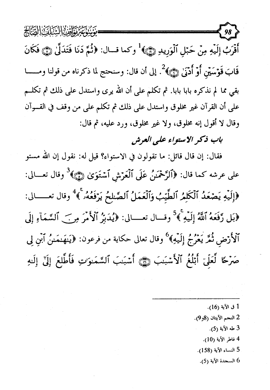 فقال: إن قال قائل: ما تقولون في الاستواء؟ قيل له: نقول إن الله مستوٍ على عرشه كما قال: {الرحمن على العرش استوى} (¬3) وقال تعالى: {إليه يصعد الكلم الطيب والعمل الصالح يرفعه} (¬4) وقال تعالى: {بَلْ رفعه الله إليه} (¬5) وقال تعالى: {يُدَبِّرُ الْأَمْرَ مِنَ السَّمَاءِ إِلَى الْأَرْضِ ثُمَّ يَعْرُجُ إِلَيْهِ} (¬6) وقال تعالى حكاية من فرعون: {يَا هَامَانُ ابْنِ لِي صَرْحًا لَعَلِّي أَبْلُغُ الْأَسْبَابَ (36) أَسْبَابَ السَّمَاوَاتِ فَأَطَّلِعَ إِلَى إِلَهِ