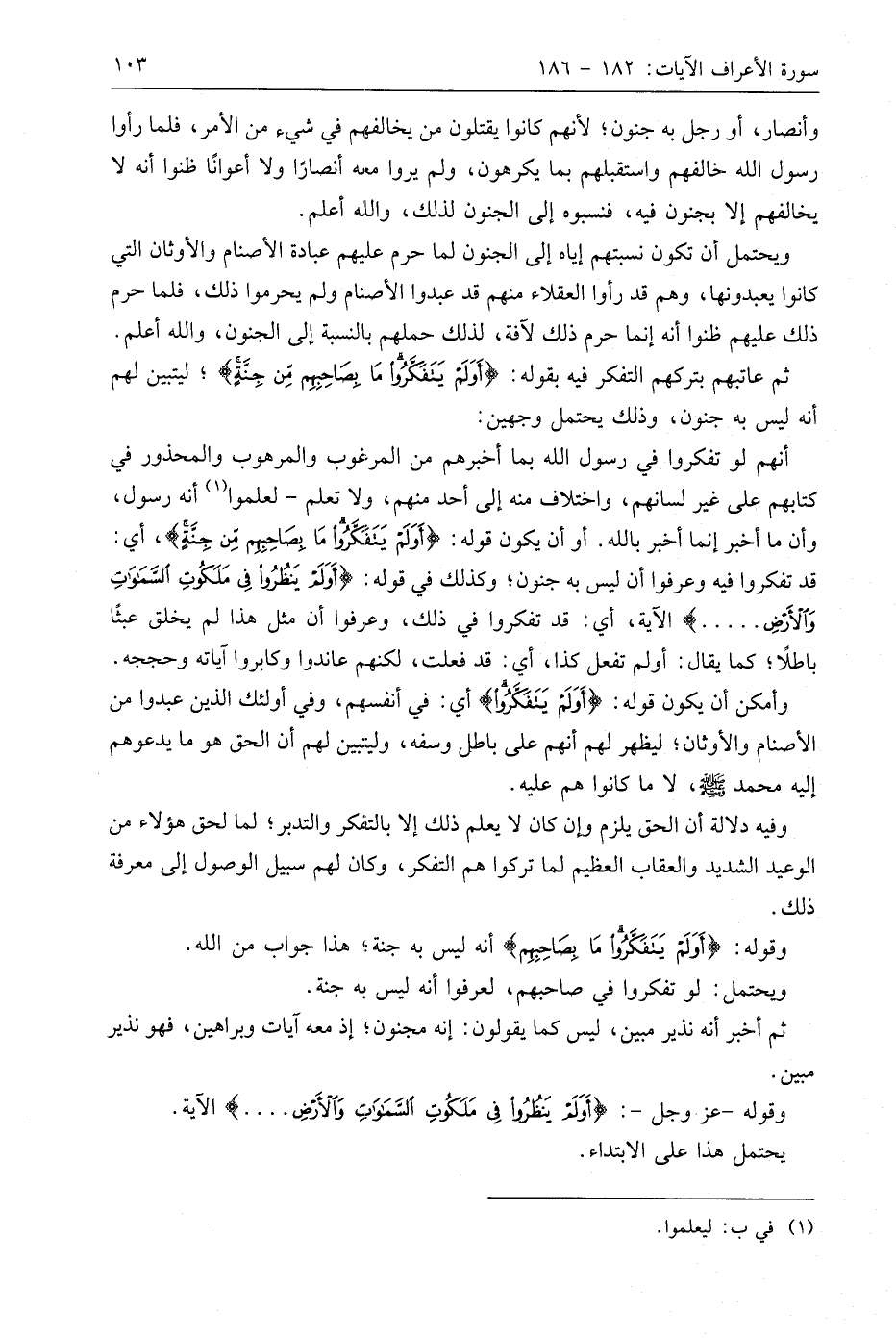 أنهم لو تفكروا في رسول اللَّه بما أخبرهم من المرغوب والمرهوب والمحذور في كتابهم على غير لسانهم، واختلاف منه إلى أحد منهم، ولا تعلم - لعلموا أنه رسول، وأن ما أخبر إنما أخبر باللَّه. أو أن يكون قوله: (أَوَلَمْ يَتَفَكَّرُوا مَا بِصَاحِبِهِمْ مِنْ جِنَّةٍ)، أي: قد تفكروا فيه وعرفوا أن ليس به جنون؛ وكذلك في قوله: (أَوَلَمْ يَنْظُرُوا فِي مَلَكُوتِ السَّمَاوَاتِ وَالْأَرْضِ. . . . .) الآية، أي: قد تفكروا في ذلك، وعرفوا أن مثل هذا لم يخلق عبثًا باطلًا؛ كما يقال: أولم تفعل كذا، أي: قد فعلت، لكنهم عاندوا وكابروا آياته وحججه.