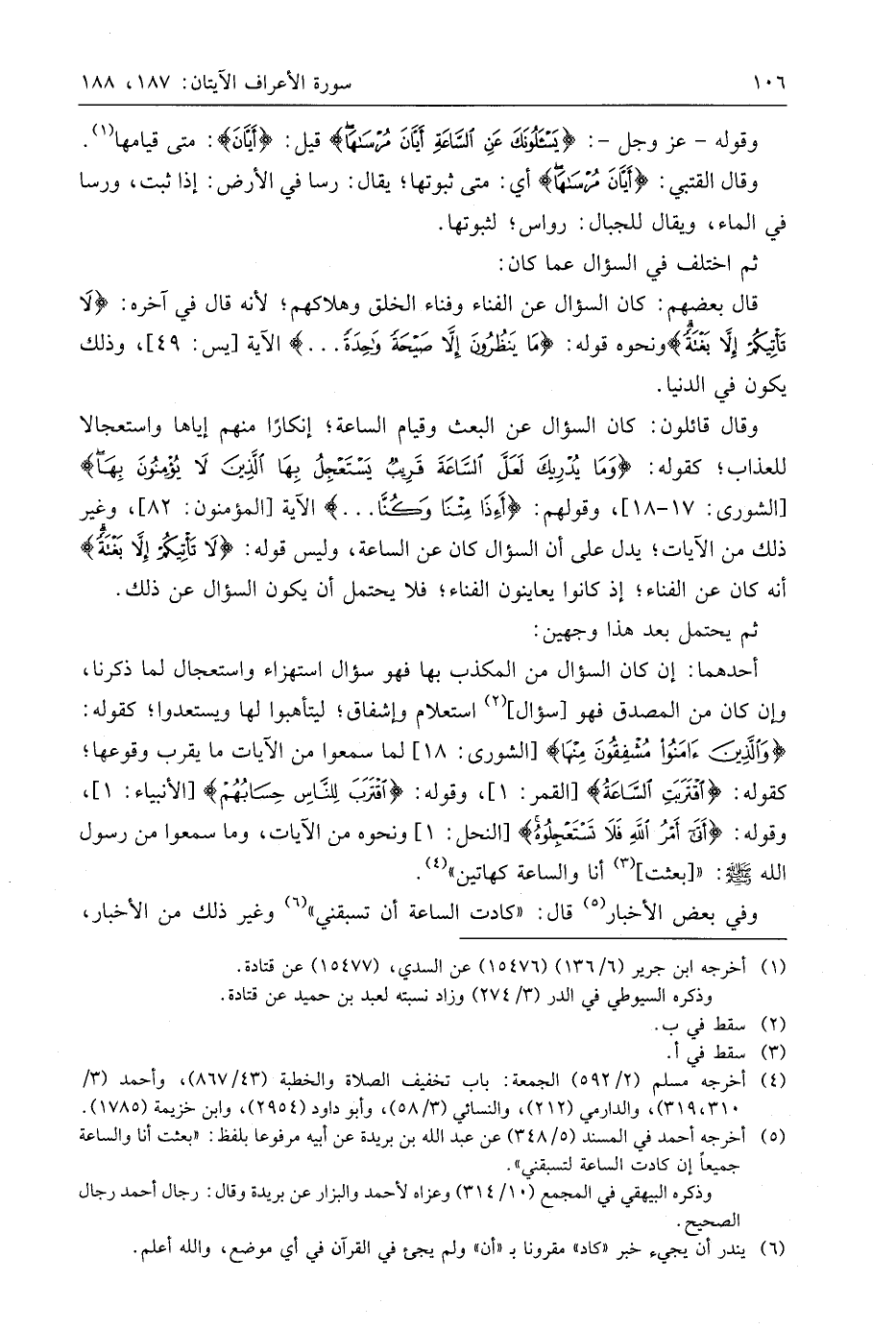 وقوله - عَزَّ وَجَلَّ -: (يَسْأَلُونَكَ عَنِ السَّاعَةِ أَيَّانَ مُرْسَاهَا ... (187) قيل: (أَيَّانَ): متى قيامها.