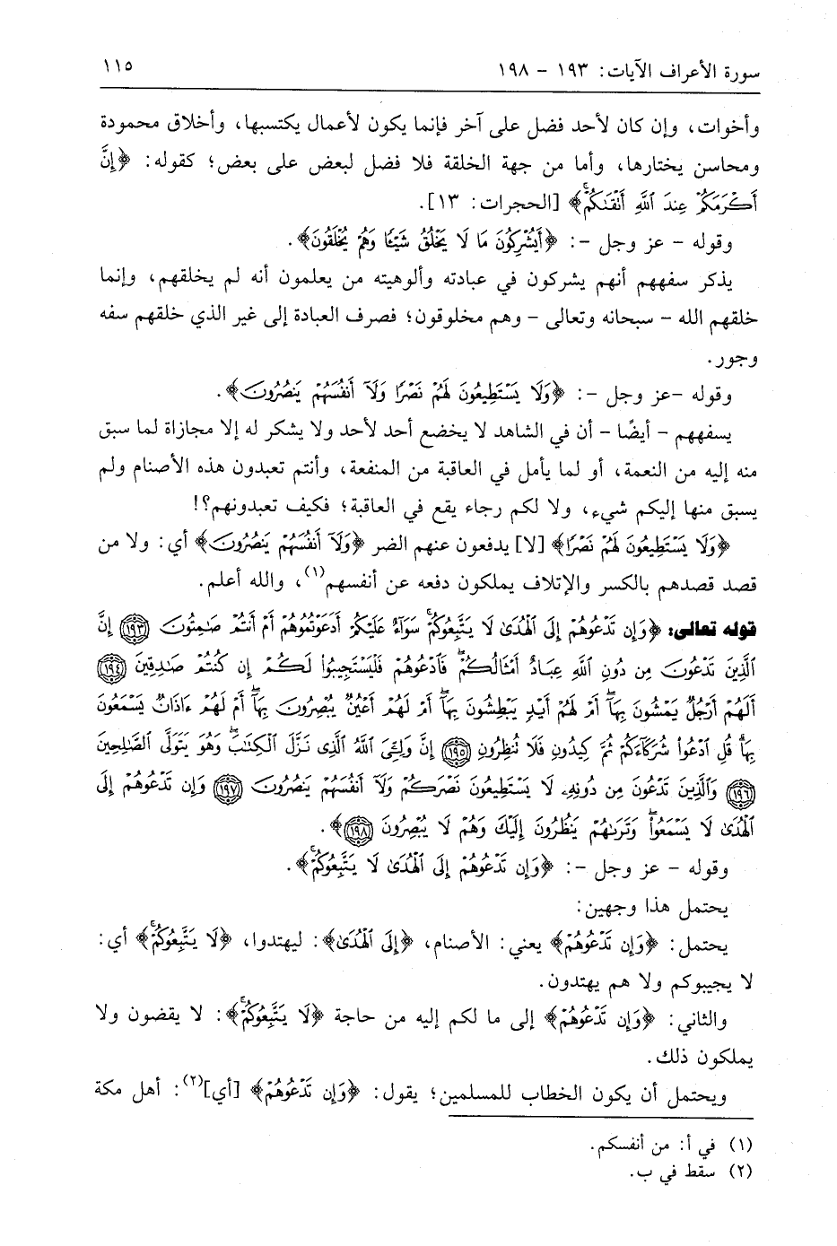 قوله تعالى: (وَإِنْ تَدْعُوهُمْ إِلَى الْهُدَى لَا يَتَّبِعُوكُمْ سَوَاءٌ عَلَيْكُمْ أَدَعَوْتُمُوهُمْ أَمْ أَنْتُمْ صَامِتُونَ (193) إِنَّ الَّذِينَ تَدْعُونَ مِنْ دُونِ اللَّهِ عِبَادٌ أَمْثَالُكُمْ فَادْعُوهُمْ فَلْيَسْتَجِيبُوا لَكُمْ إِنْ كُنْتُمْ صَادِقِينَ (194) أَلَهُمْ أَرْجُلٌ يَمْشُونَ بِهَا أَمْ لَهُمْ أَيْدٍ يَبْطِشُونَ بِهَا أَمْ لَهُمْ أَعْيُنٌ يُبْصِرُونَ بِهَا أَمْ لَهُمْ آذَانٌ يَسْمَعُونَ بِهَا قُلِ ادْعُوا شُرَكَاءَكُمْ ثُمَّ كِيدُونِ فَلَا تُنْظِرُونِ (195) إِنَّ وَلِيِّيَ اللَّهُ الَّذِي نَزَّلَ الْكِتَابَ وَهُوَ يَتَوَلَّى الصَّالِحِينَ (196) وَالَّذِينَ تَدْعُونَ مِنْ دُونِهِ لَا يَسْتَطِيعُونَ نَصْرَكُمْ وَلَا أَنْفُسَهُمْ يَنْصُرُونَ (197) وَإِنْ تَدْعُوهُمْ إِلَى الْهُدَى لَا يَسْمَعُوا وَتَرَاهُمْ يَنْظُرُونَ إِلَيْكَ وَهُمْ لَا يُبْصِرُونَ (198)