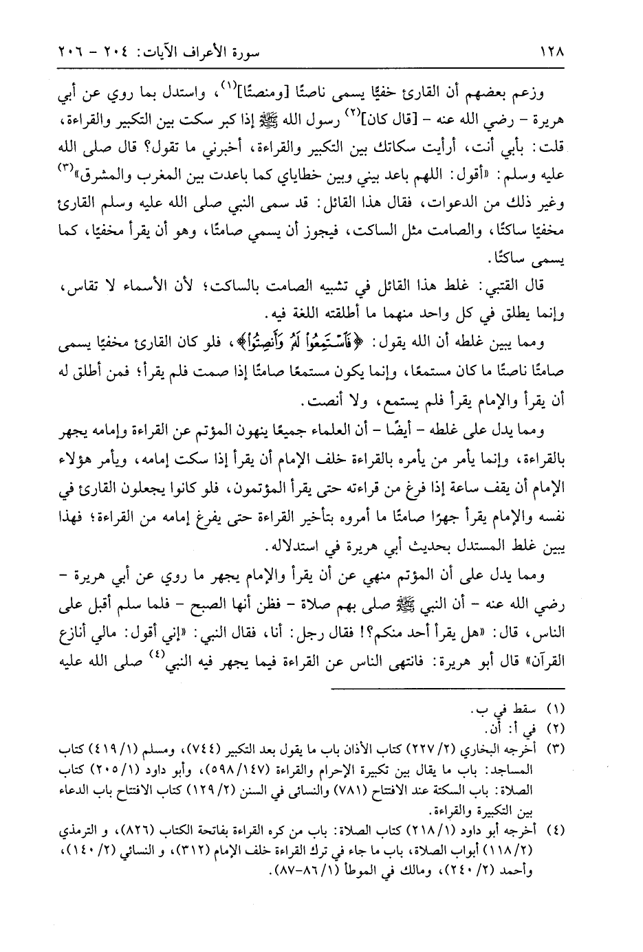 وزعم بعضهم أن القارئ خفيا يسمى ناصتًا ومنصتًا، واستدل بما روي عن أبي هريرة - رَضِيَ اللَّهُ عَنْهُ - قال كان رسول اللَّه - صَلَّى اللَّهُ عَلَيهِ وَسَلَّمَ - إذا كبر سكت بين التكبير والقراءة، قلت: بأبي أنت، أرأيت سكاتك بين التكبير والقراءة، أخبرني ما تقول؟ قال صلى الله عليه وسلم: " أقول: اللهم باعد بيني وبين خطاياي كما باعدت بين المغرب والمشرق " وغير ذلك من الدعوات، فقال هذا القائل: قد سمى النبي صَلَّى اللَّهُ عَلَيهِ وَسَلَّمَ القارئ مخفيا ساكتًا، والصامت مثل الساكت، فيجوز أن يسمي صامتًا، وهو أن يقرأ مخفيًا، كما يسمى ساكتا.