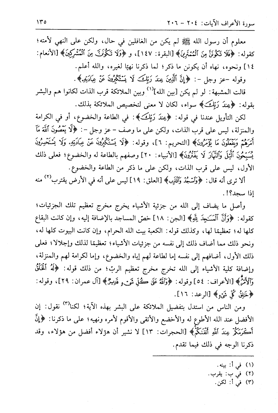 وقوله - عَزَّ وَجَلَّ -: (إِنَّ الَّذِينَ عِنْدَ رَبِّكَ لَا يَسْتَكْبِرُونَ عَنْ عِبَادَتِهِ ... (206)