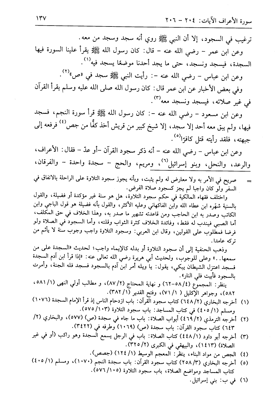 وعن ابن عَبَّاسٍ - رَضِيَ اللَّهُ عَنْهُ - أنه ذكر سجود القرآن - أو عدّ - فقال: الأعراف، والرعد، والنحل، وبنو إسرائيل، ومريم، والحج - سجدة واحدة - والفرقان،