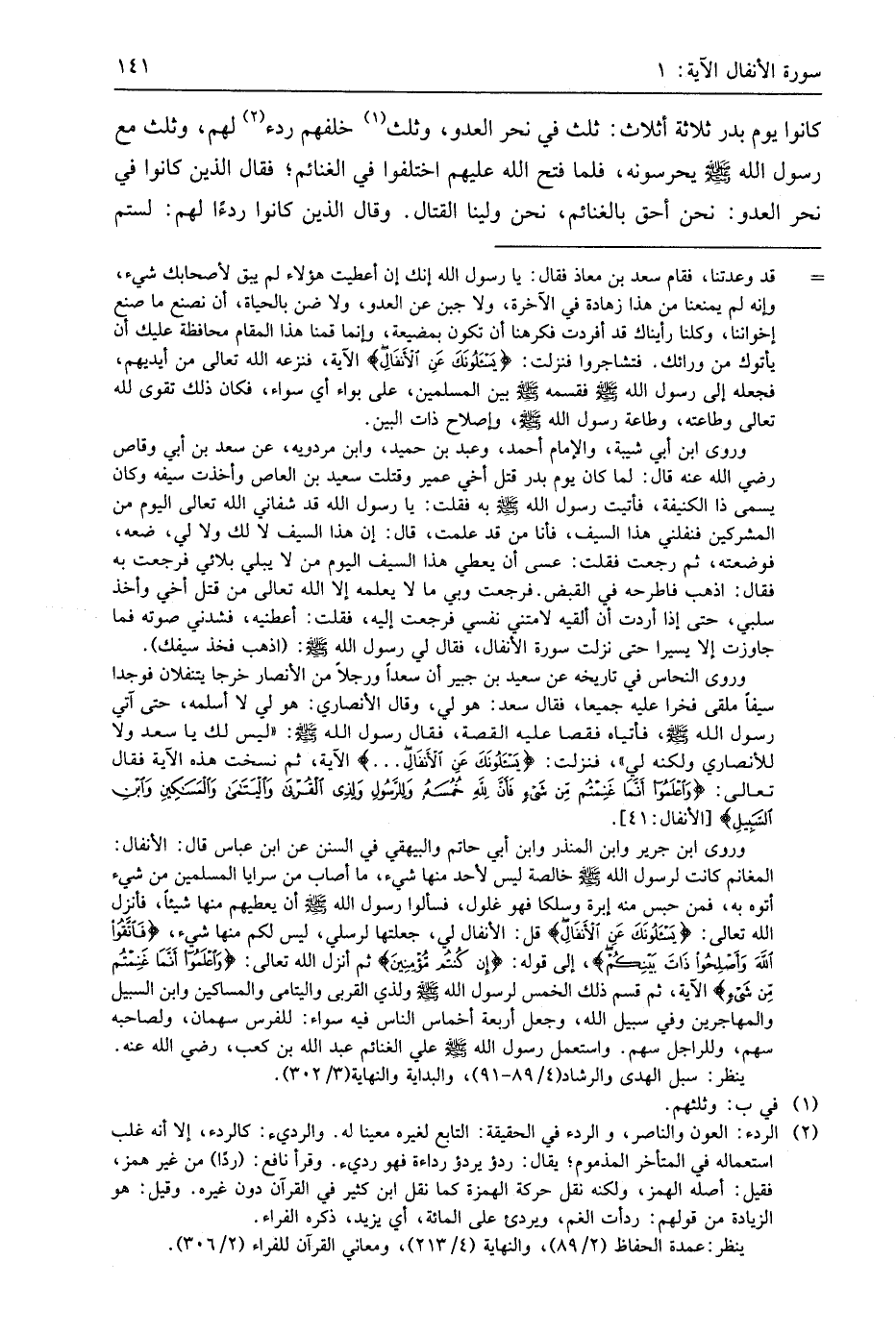 كانوا يوم بدر ثلاثة أثلاث: ثلث في نحر العدو، وثلث خلفهم ردء لهم، وثلث مع رسول اللَّه - صَلَّى اللَّهُ عَلَيهِ وَسَلَّمَ - يحرسونه، فلما فتح اللَّه عليهم اختلفوا في الغنائم؛ فقال الذين كانوا في نحر العدو: نحن أحق بالغنائم، نحن ولينا القتال. وقال الذين كانوا ردءًا لهم: لستم