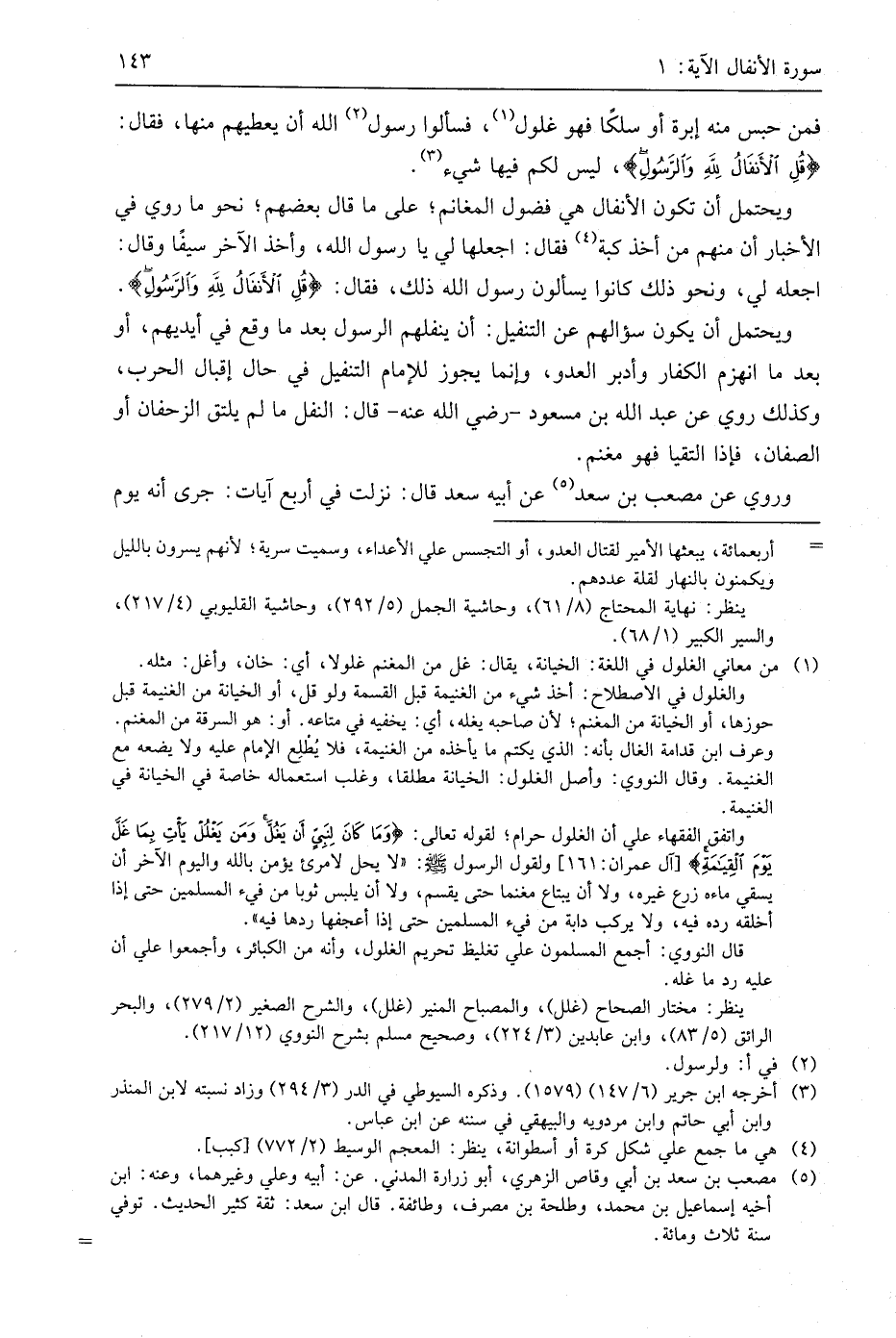 فمن حبس منه إبرة أو سلكًا فهو غلول، فسألوا رسول اللَّه أن يعطيهم منها، فقال: (قُلِ الأَنفَالُ لِلََّهِ وَالرَّسُولِ)، ليس لكم فيها شيء.