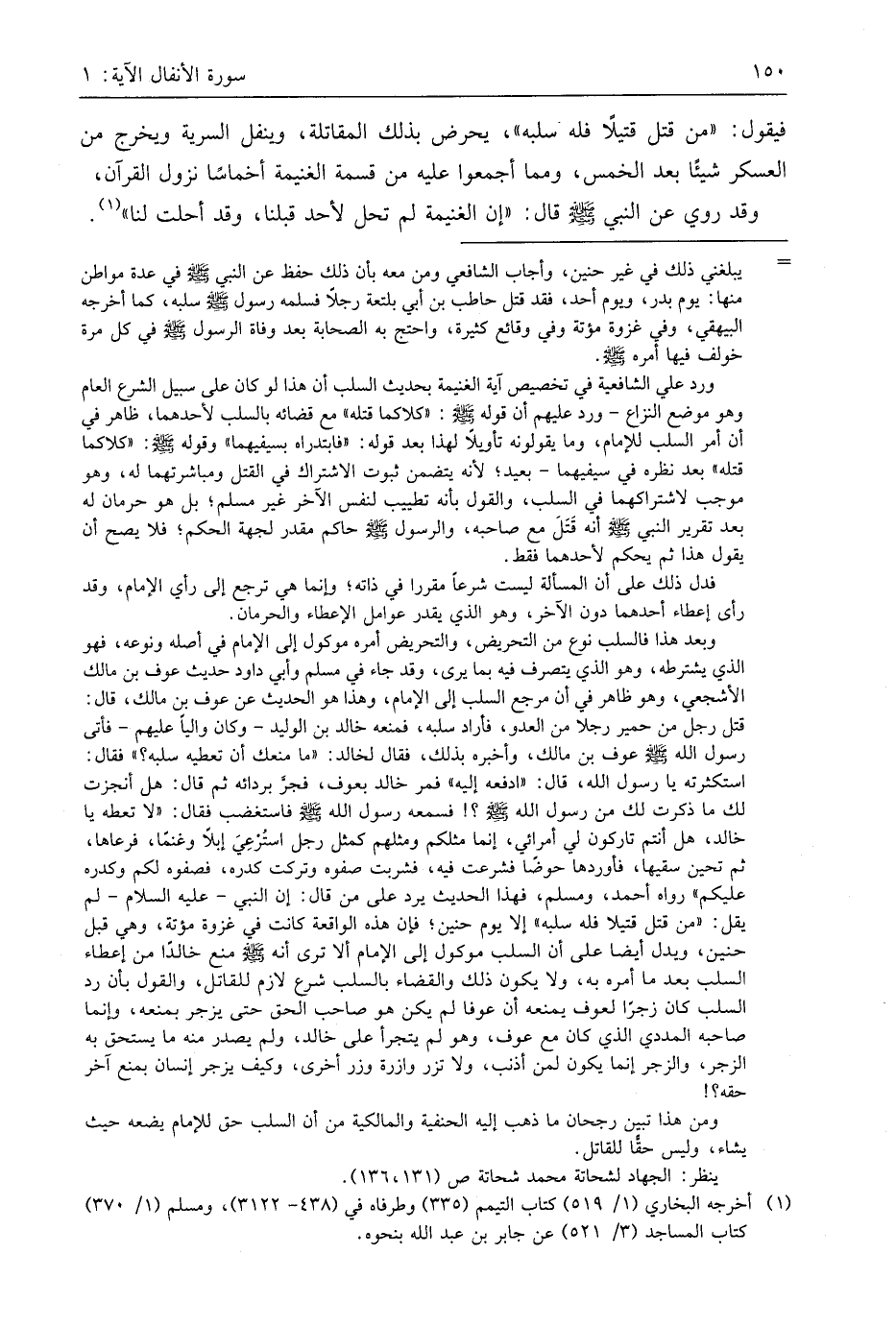 فيقول: " من قتل قتيلًا فله سلبه "، يحرض بذلك المقاتلة، وينفل السرية ويخرج من العسكر شيئا بعد الخمس، ومما أجمعوا عليه من قسمة الغنيمة أخماسًا نزول القرآن، وقد روي عن النبي - صَلَّى اللَّهُ عَلَيهِ وَسَلَّمَ - قال: " إن الغنيمة لم تحل لأحد قبلنا، وقد أحلت لنا ".