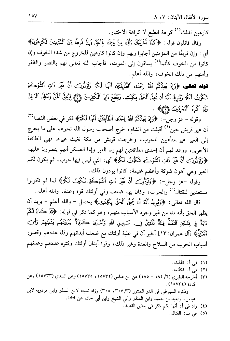 قوله تعالى: (وَإِذْ يَعِدُكُمُ اللَّهُ إِحْدَى الطَّائِفَتَيْنِ أَنَّهَا لَكُمْ وَتَوَدُّونَ أَنَّ غَيْرَ ذَاتِ الشَّوْكَةِ تَكُونُ لَكُمْ وَيُرِيدُ اللَّهُ أَنْ يُحِقَّ الْحَقَّ بِكَلِمَاتِهِ وَيَقْطَعَ دَابِرَ الْكَافِرِينَ (7) لِيُحِقَّ الْحَقَّ وَيُبْطِلَ الْبَاطِلَ وَلَوْ كَرِهَ الْمُجْرِمُونَ (8)
