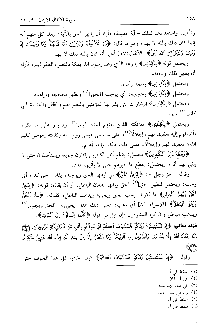 ويحتمل (بِكَلِمَاتِهِ) ملائكته الذين بعثهم أمددا لهم، يوم بدر على ما ذكر، فأضافهم إليه تعظيمًا لهم وإجلالًا، على ما سمى عيسى روح اللَّه وكلمته وموسى كليم اللَّه؛ تعظيمًا لهم وإجلالًا، فعلى ذلك هذا، واللَّه أعلم.