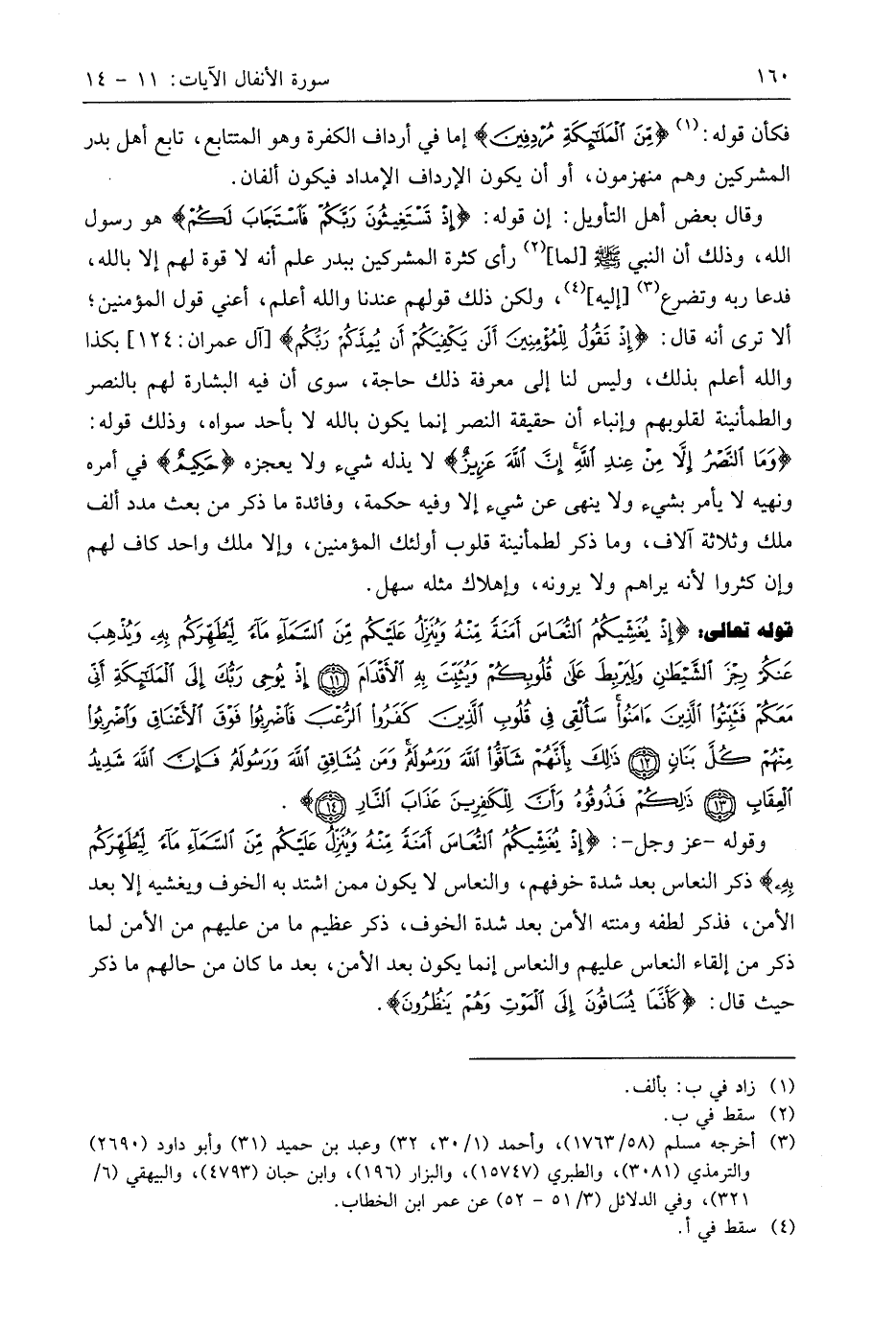 قوله تعالى: (إِذْ يُغَشِّيكُمُ النُّعَاسَ أَمَنَةً مِنْهُ وَيُنَزِّلُ عَلَيْكُمْ مِنَ السَّمَاءِ مَاءً لِيُطَهِّرَكُمْ بِهِ وَيُذْهِبَ عَنْكُمْ رِجْزَ الشَّيْطَانِ وَلِيَرْبِطَ عَلَى قُلُوبِكُمْ وَيُثَبِّتَ بِهِ الْأَقْدَامَ (11) إِذْ يُوحِي رَبُّكَ إِلَى الْمَلَائِكَةِ أَنِّي مَعَكُمْ فَثَبِّتُوا الَّذِينَ آمَنُوا سَأُلْقِي فِي قُلُوبِ الَّذِينَ كَفَرُوا الرُّعْبَ فَاضْرِبُوا فَوْقَ الْأَعْنَاقِ وَاضْرِبُوا مِنْهُمْ كُلَّ بَنَانٍ (12) ذَلِكَ بِأَنَّهُمْ شَاقُّوا اللَّهَ وَرَسُولَهُ وَمَنْ يُشَاقِقِ اللَّهَ وَرَسُولَهُ فَإِنَّ اللَّهَ شَدِيدُ الْعِقَابِ (13) ذَلِكُمْ فَذُوقُوهُ وَأَنَّ لِلْكَافِرِينَ عَذَابَ النَّارِ (14)