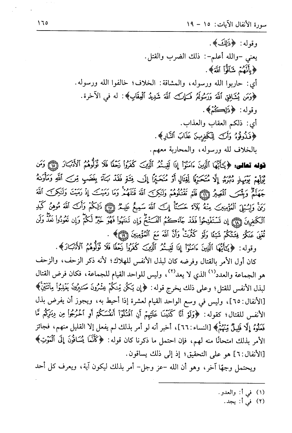 قوله تعالى: (يَا أَيُّهَا الَّذِينَ آمَنُوا إِذَا لَقِيتُمُ الَّذِينَ كَفَرُوا زَحْفًا فَلَا تُوَلُّوهُمُ الْأَدْبَارَ (15) وَمَنْ يُوَلِّهِمْ يَوْمَئِذٍ دُبُرَهُ إِلَّا مُتَحَرِّفًا لِقِتَالٍ أَوْ مُتَحَيِّزًا إِلَى فِئَةٍ فَقَدْ بَاءَ بِغَضَبٍ مِنَ اللَّهِ وَمَأْوَاهُ جَهَنَّمُ وَبِئْسَ الْمَصِيرُ (16) فَلَمْ تَقْتُلُوهُمْ وَلَكِنَّ اللَّهَ قَتَلَهُمْ وَمَا رَمَيْتَ إِذْ رَمَيْتَ وَلَكِنَّ اللَّهَ رَمَى وَلِيُبْلِيَ الْمُؤْمِنِينَ مِنْهُ بَلَاءً حَسَنًا إِنَّ اللَّهَ سَمِيعٌ عَلِيمٌ (17) ذَلِكُمْ وَأَنَّ اللَّهَ مُوهِنُ كَيْدِ الْكَافِرِينَ (18) إِنْ تَسْتَفْتِحُوا فَقَدْ جَاءَكُمُ الْفَتْحُ وَإِنْ تَنْتَهُوا فَهُوَ خَيْرٌ لَكُمْ وَإِنْ تَعُودُوا نَعُدْ وَلَنْ تُغْنِيَ عَنْكُمْ فِئَتُكُمْ شَيْئًا وَلَوْ كَثُرَتْ وَأَنَّ اللَّهَ مَعَ الْمُؤْمِنِينَ (19)