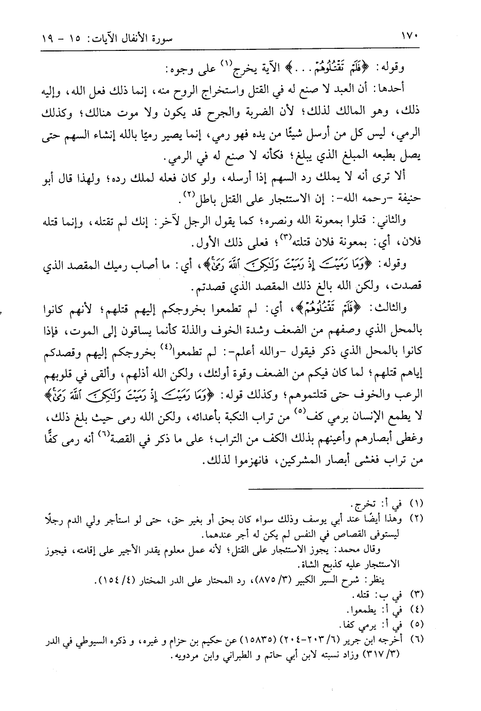 والثالث: (فَلَمْ تَقْتُلُوهُمْ)، أي: لم تطمعوا بخروجكم إليهم قتلهم؛ لأنهم كانوا بالمحل الذي وصفهم من الضعف وشدة الخوف والذلة كأنما يساقون إلى الموت، فإذا كانوا بالمحل الذي ذكر فيقول - واللَّه أعلم -: لم تطمعوا بخروجكم إليهم وقصدكم إياهم قتلهم؛ لما كان فيكم من الضعف وقوة أُولَئِكَ، ولكن اللَّه أذلهم، وألقى في قلوبهم الرعب والخوف حتى قتلتموهم؛ وكذلك قوله: (وَمَا رَمَيْتَ إِذْ رَمَيْتَ وَلَكِنَّ اللَّهَ رَمَى) لا يطمع الإنسان برمي كف من تراب النكبة بأعدائه، ولكن اللَّه رمى حيث بلغ ذلك، وغطى أبصارهم وأعينهم بذلك الكف من التراب؛ على ما ذكر في القصة أنه رمى كفًّا من تراب فغشى أبصار المشركين، فانهزموا لذلك.