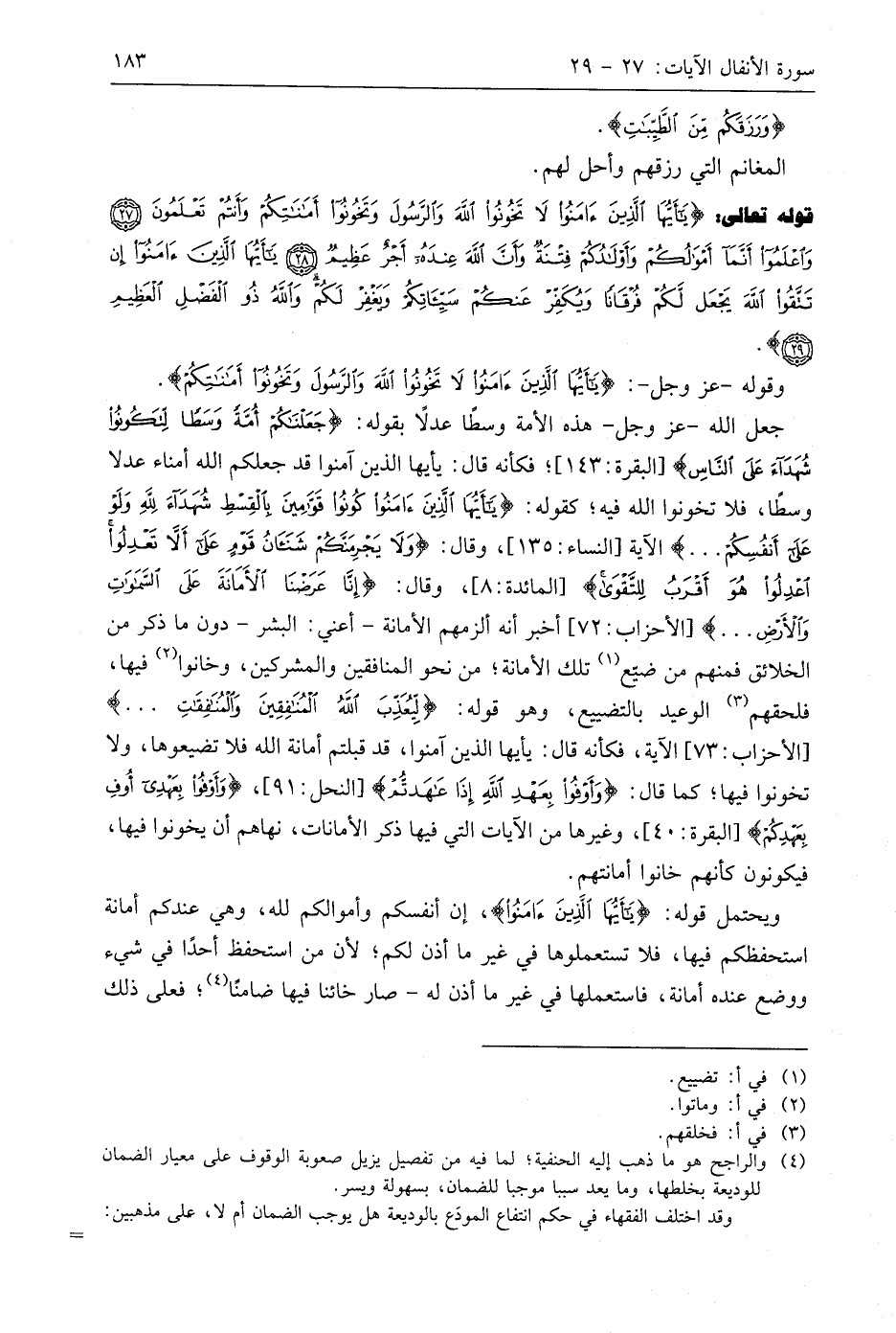 قوله تعالى: (يَا أَيُّهَا الَّذِينَ آمَنُوا لَا تَخُونُوا اللَّهَ وَالرَّسُولَ وَتَخُونُوا أَمَانَاتِكُمْ وَأَنْتُمْ تَعْلَمُونَ (27) وَاعْلَمُوا أَنَّمَا أَمْوَالُكُمْ وَأَوْلَادُكُمْ فِتْنَةٌ وَأَنَّ اللَّهَ عِنْدَهُ أَجْرٌ عَظِيمٌ (28) يَا أَيُّهَا الَّذِينَ آمَنُوا إِنْ تَتَّقُوا اللَّهَ يَجْعَلْ لَكُمْ فُرْقَانًا وَيُكَفِّرْ عَنْكُمْ سَيِّئَاتِكُمْ وَيَغْفِرْ لَكُمْ وَاللَّهُ ذُو الْفَضْلِ الْعَظِيمِ (29)
