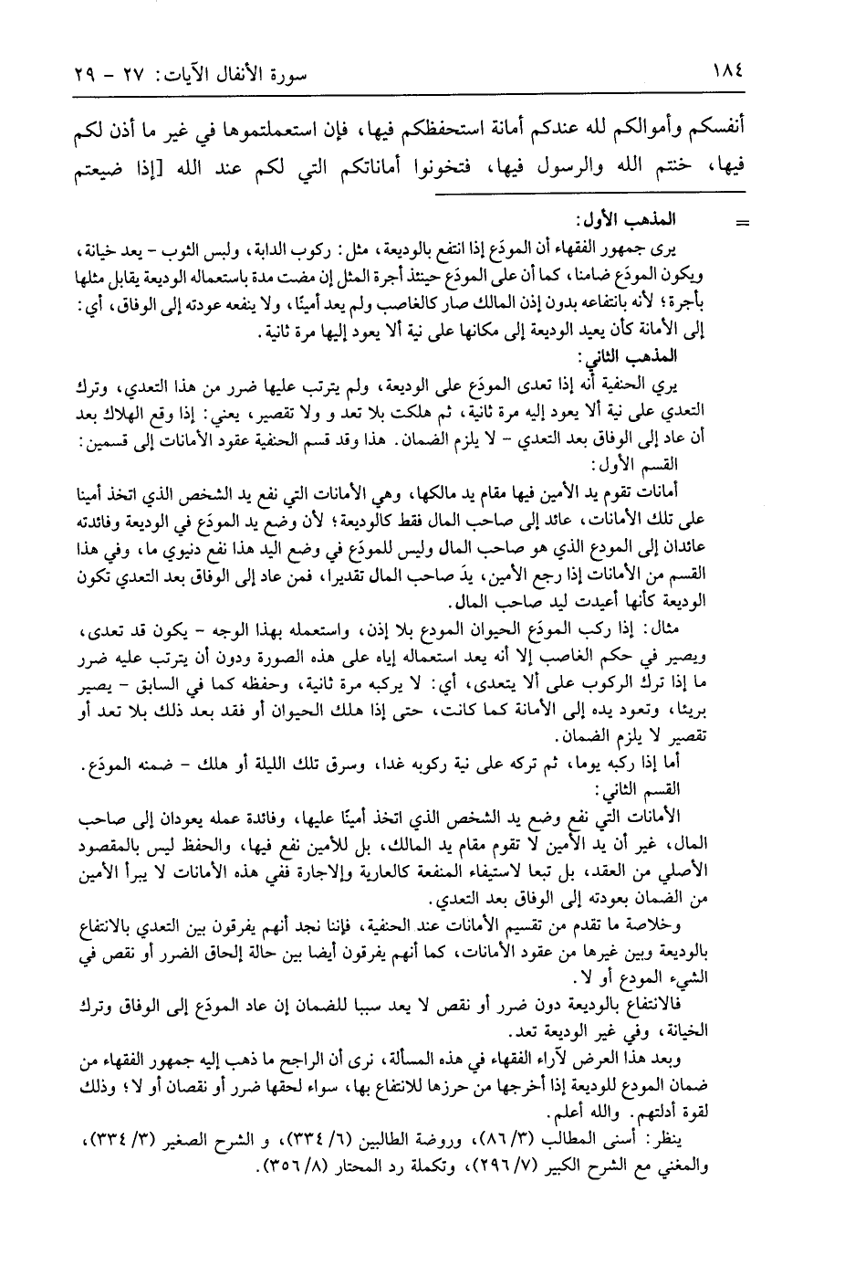 أنفسكم وأموالكم لله عندكم أمانة استحفظكم فيها، فإن استعملتموها في غير ما أذن لكم فيها، خنتم اللَّه والرسول فيها، فتخونوا أماناتكم التي لكم عند اللَّه إذا ضيعتم